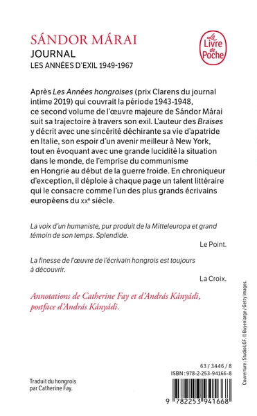 Suite du journal intime de l'écrivain Sándor Márai, couvrant la période de son exil de 1949 à 1967. Il y relate sa vie d'apatride en Italie, ses espoirs d'un avenir meilleur à New York et son regard lucide sur le monde en pleine guerre froide. Un témoignage poignant d'un humaniste au destin tourmenté. Cette édition est annotée et complétée par Catherine Fay et András Kányádi, avec une postface de ce dernier. Traduit du hongrois par Catherine Fay. Afficher moinsAfficher plus