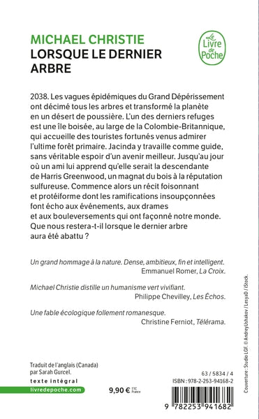 En 2038, après la disparition des arbres due à des épidémies, la Terre est devenue un désert de poussière. Jacinda, guide sur une île boisée, découvre être la descendante d'un magnat du bois. Son destin se mêle aux secrets de sa famille et aux bouleversements du monde. Un roman dense mêlant saga familiale, dystopie et réflexion écologique. Afficher moinsAfficher plus