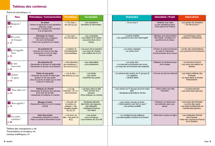 PrésentationBonjour et bienvenue  !  : une méthode de français«  tout-en-un » (livre-cahier), destinéeà des apprenants débutants, pour une entrée en douceur dans la langue française.  La collection comprend 2 niveaux  : A1.1 et A1.2. Il existeégalement des versions bilingues pour le niveau A1.1 (pour anglophones, arabophones, coréanophones, sinophones-chinois simplifié et sinophones-chinois traditionnel).   Découvrez un extrait de Bonjour et bienvenue  ! tout en français, niveau A1.1 ici  :https://bit.ly/45eVVwL   Bonjour et bienvenue ! A1.1 (livre-cahier), c’est :8 courtes leçonspour assimiler les bases de la langue française  ;une attention particulière portée au travail de laphonétique: un précis de phonétique, des pages entières dans les leçons et34 vidéos d’aideà la prononciation  ;unvocabulaire illustré, enregistré et plurilingueaccompagné d’un guide de communication  ;uneapproche interculturellepour se familiariser avec les habitudes et les comportements des Français  ;une bande dessinéepour remettre en contexte les contenus des leçons  ;les corrigés et les transcriptions  ;un bilan pour chaque leçon et uneévaluation finale.En + du livre-cahier,la méthode propose :unaccès direct aux audios et aux 34 vidéos de phonétiqueen flashant les pages avec l’application didierfle.app ;les audios et les vidéos de phonétiqueégalement accessibles via  le site compagnonwww.didierfle-bonjourbienvenue.fr  ;unfichier«  Bilans etévaluation finale » téléchargeable gratuitementavec un compte professeur sur la fiche concernée sur le sitewww.didierfle.com/bonjouretbienvenue. Également disponibleà la vente sur laeboutique.didierfle.com  :le livre- cahier numériquePour accéder directementà votre ouvrage età ses ressources sur la plateformeEducadhocet bénéficier de toutes les fonctionnalités de celle-ci. Afficher moinsAfficher plus