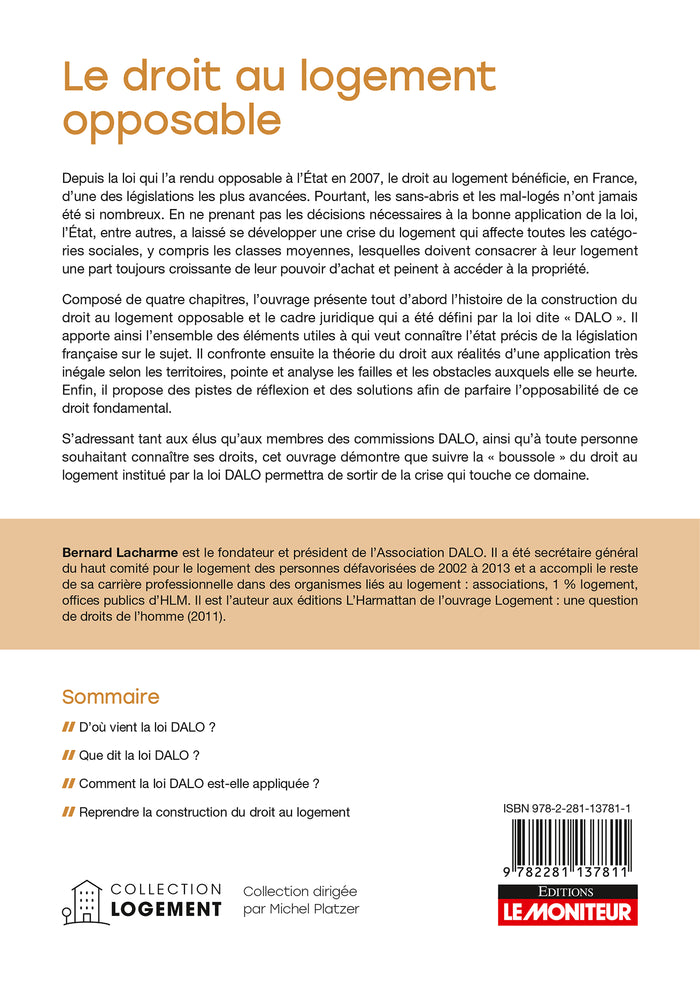 PrésentationDepuis la loi qui l’a rendu opposableà l’État en 2007, le droit au logement bénéficie, en France, d’une des législations les plus avancées. Pourtant, les sans-abris et les mal-logés n’ont jamaisété si nombreux. En ne prenant pas les décisions nécessairesà la bonne application de la loi, l’État, entre autres, a laissé se développer une crise du logement qui affecte toutes les catégories sociales, y compris les classes moyennes, lesquelles doivent consacrerà leur logement une part toujours croissante de leur pouvoir d’achat et peinentà accéderà la propriété. Composé de quatre chapitres, l’ouvrage présente tout d’abord l’histoire de la construction du droit au logement opposable et le cadre juridique qui aété défini par la loi dite« DALO». Il apporte ainsi l’ensemble deséléments utilesà qui veut connaître l’état précis de la législation française sur le sujet. Il confronte ensuite la théorie du droit aux réalités d’une application très inégale selon les territoires, pointe et analyse les failles et les obstacles auxquels elle se heurte. Enfin, il propose des pistes de réflexion et des solutions afin de parfaire l’opposabilité de ce droit fondamental. S’adressant tant auxélus qu’aux membres des commissions DALO, ainsi qu’à toute personne souhaitant connaître ses droits, cet ouvrage démontre que suivre la« boussole» du droit au logement institué par la loi DALO permettra de sortir de la crise qui touche ce domaine. Afficher moinsAfficher plus