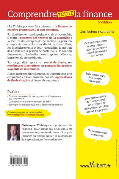 'Comprendre toute la finance' est un ouvrage de référence qui propose une approche complète et pédagogique des concepts financiers. Rédigé par Christophe Thibierge, professeur à l'ESCP Europe, ce livre aborde les notions essentielles, les outils opérationnels et les formules clés de la finance. L'auteur adopte un style alerte et humoristique, illustrant ses propos à travers des dialogues et des exemples issus du cinéma et de la littérature. Cette nouvelle édition inclut des exercices corrigés et des activités de fin de chapitre, ainsi qu'un site dédié pour approfondir ses connaissances.'