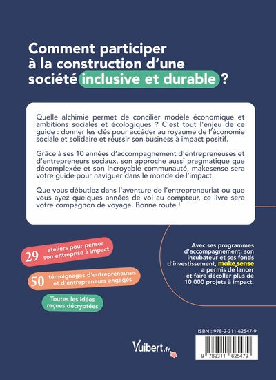 En bref Le guide de survie pour inventer le changement! ,Sommaire Partie 1. Se plonger dans l’entrepreneuriat à impact:savoir d’où l’on vient pour mieux savoir où l’on va 1. Décryptage : l’entrepreneuriat à impact Partie 2. S’allonger sur le divan:les grandes questions à se poser avant de se lancer (sur soi, sur son projet) 2. Ça commence par moi 3. La ligne d’arrivée, c’est quoi l’horizon ? 4. Tout ça pour quoi ? À quel type d’entrepreneuriat j’aspire ? 5. Ai-je vraiment la bonne idée ? Les idées reçues à déconstruire Partie 3. Préparer son expédition:ne rien oublier pour lancer son projet dans le monde de l’impact 6. Les toutes premières fois : premières actions, premiers bénéficiaires… 7. Construire la bonne équipe de fondateurs, la mince affaire ! 8. C’est quoi un bon soutien ? Incubateur, mentors, coach, on fait le tri ! 9. Ensemble on va plus loin ! Comment mobiliser ses bénéficiaires pour développer son projet 10. SAS, coopérative, association : quelle structuration légale choisir ? Les idées reçues à déconstruire Partie 4. Voyager sans se perdre:vivre l’aventure entrepreneuriale et garder le cap 11. Comment se financer pour grandir sereinement ? 12. Le nerf de la guerre : les talents 13. Gouvernance, y a-t-il forcément un capitaine dans le bateau ? 14. La mesure d’impact, besoin d’un double décimètre ? Les idées reçues à déconstruire ,Présentation Le guide de survie pour inventer le changement! Comment participer à la construction d'une société inclusive et durable ? Quelle alchimie permet de concilier modèle économique et ambitions sociales et écologiques? C’est tout l’enjeu de ce guide : donner les clés pour accéder au royaume de l’économie sociale et solidaire et réussir son business à impact positif. Grâce à ses 10 années d’accompagnement d’entrepreneuses et d’entrepreneurs sociaux, son approche aussi pragmatique que décomplexée et son incroyable communauté,makesense sera votre guide pour naviguer dans le monde de l’impact. Au programme: 29 atelierspour penser son entreprise à impact50 témoignagesd'entrepreneuses et d'entrepreneurs engagésToutes les idées reçues décryptées Que vous débutiez dans l’aventure de l’entrepreneuriat ou que vous ayez quelques années de vol au compteur, ce livre sera votre compagnon de voyage. Bonne route !   Afficher moinsAfficher plus