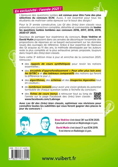 Cet ouvrage, rédigé par Enzo Védrine et David Mutin, propose une correction détaillée et commentée de toutes les questions isolées tombées aux concours 2016 à 2021. Les étudiants en médecine y trouveront des rappels de cours, des encadrés d'approfondissement, des algorithmes et des conseils pour optimiser leurs révisions. Les auteurs partagent leur expertise de l'épreuve des QI, dans le but d'aider les candidats à se démarquer lors du concours. Afficher moinsAfficher plus