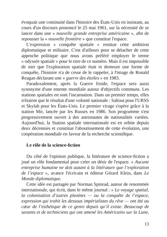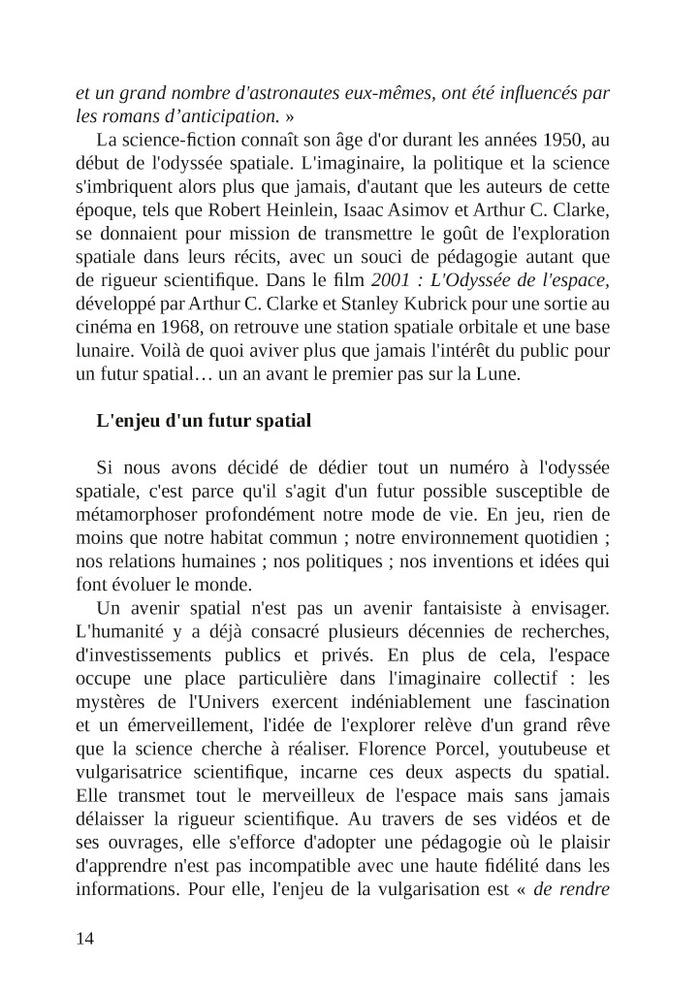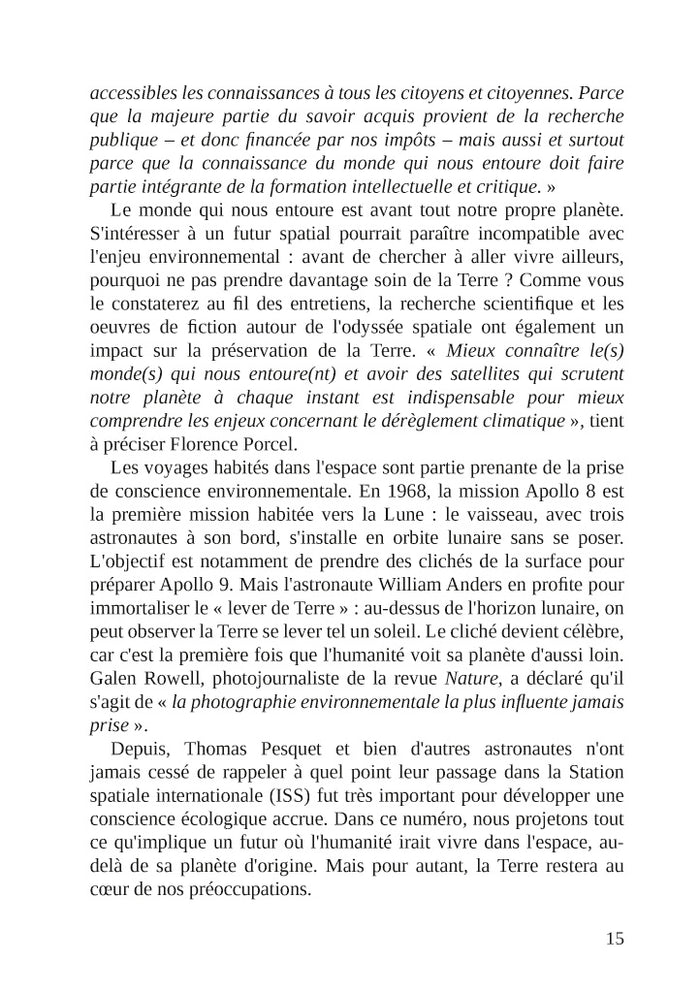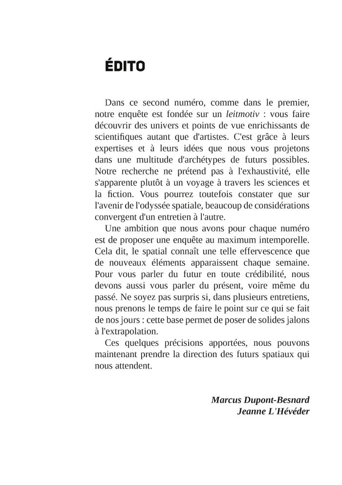 PrésentationDans cette nouvelle enquête, Marcus Dupont-Besnard et Jeanne L'Hévéder sont partis explorer les futurs de l'humanité dans l'espace. Si nous allons vivre sur Mars, sur la Lune, ou dans des stations spatiales, à quoi pourront bien ressembler nos habitats ? Comment pourrons-nous manger et boire ? Quels seront les nouveaux enjeux politiques et économiques ?Découvrez dans ce numéro des entretiens inédits au coeur de l'innovation scientifique et technologique, avec l'astronaute Thomas Pesquet, des architectes spatiaux, des ingénieur-e-s et des responsables de la NASA et de l'ESA. Les imaginaires font partie intégrante de cette exploration : en plus de rencontres littéraires et artistiques avec Laurent Genefort, Becky Chambers ou Marion Montaigne, ce numéro vous plonge dans le quotidien de scénaristes et producteurs de séries comme Star Trek et Stargate. Afficher moinsAfficher plus