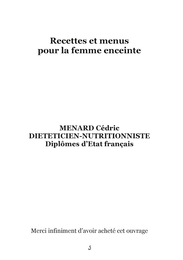 Cet ouvrage culinaire s'adresse aux femmes enceintes en bonne santé. Il propose de nombreuses recettes simples à mettre en pratique, permettant de mieux gérer l'alimentation spécifique associée à la grossesse. L'ouvrage vise à apprendre rapidement à ajuster les recettes traditionnelles pour les adapter efficacement à la grossesse. L'auteur, Cédric Menard, propose également trois semaines de menus inédits, idéalement adaptés à cette période particulière.