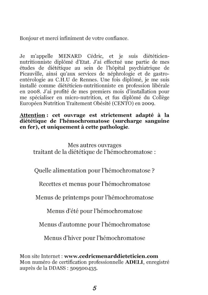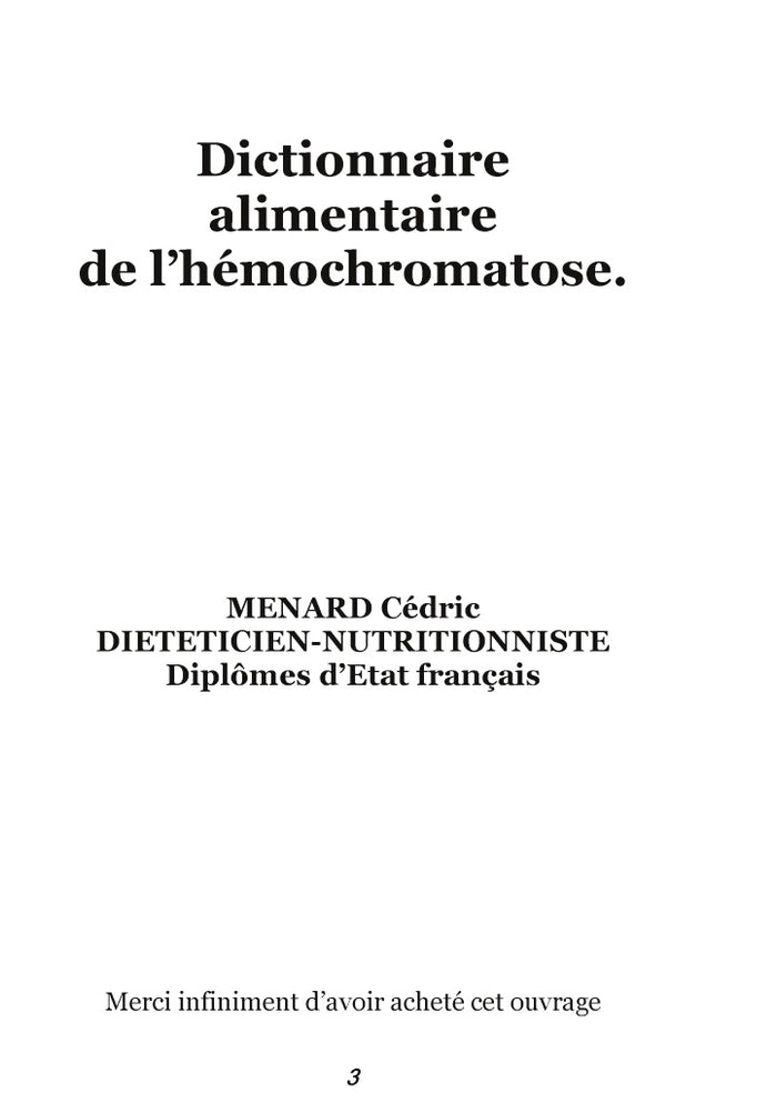 Ce dictionnaire alimentaire spécifique s'adresse aux personnes souffrant d'hémochromatose, une maladie génétique provoquant une surcharge en fer. L'auteur, Cédric Menard, propose un classement de près de 3000 aliments selon leur intérêt nutritionnel pour les personnes atteintes de cette maladie. Les aliments sont catégorisés comme protecteurs, neutres, déconseillés ou très déconseillés, permettant ainsi aux patients de mieux gérer leur alimentation. Cet ouvrage constitue une ressource indispensable pour adapter son régime alimentaire en cas d'hémochromatose. Afficher moinsAfficher plus
