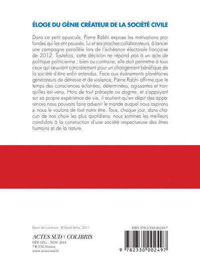 .Biographie de l'auteurAgriculteur, écrivain et penseur français d’origine algérienne, Pierre Rabhi défend un mode de société plus respectueux de l’homme et de la nature. Il soutient le développement de l’agroécologie à travers le monde et en particulier en Afrique pour contribuer à l’autonomie, la sécurité et la salubrité alimentaires des populations. Il a créé de multiples associations telles que «Colibris» et «Terre et Humanisme», destinées à relier l’homme à la nature, et a fait de l’exemplarité un choix philosophique, pour amener de plus en plus de gens à s’interroger. Il est l’auteur de nombreux ouvrages dont Vers la sobriété heureuse (2010) chez Actes Sud, et Olivier Le Naire a publié dans la collection “Domaine du possible” un livre d’entretien, Pierre Rabhi semeur d’espoirs, en octobre 2013 (Actes Sud). En 2014, Pierre Rabhi a contribué à l’ouvrage collectif Nos Voies d’espérance (Actes Sud – Les Liens Qui Libèrent).