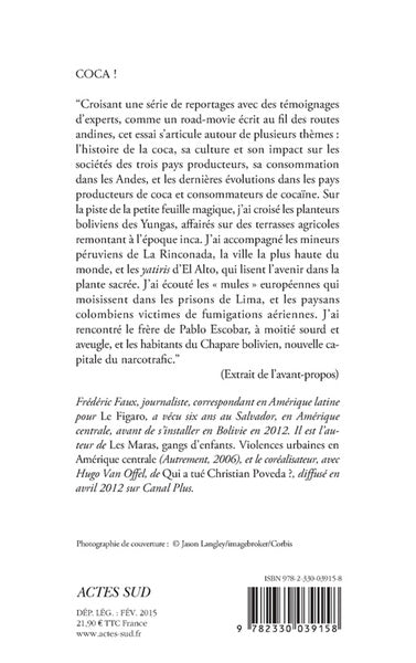 4e de couvertureDe la culture et la consommation traditionnelles de la feuille de coca jusqu'aux raids des commandos militaires dans les jungles andines, en passant par des rencontres avec des "mules" qui croupissent en prison et les dernières techniques des trafiquants de poudre blanche - Coca ! parcourt la Bolivie, le Pérou, et la Colombie pour nous faire découvrir les coulisses du spectacle terrifiant de la cocaïne, ennemie publique numéro un des gouvernements occidentaux. Avec cette enquête passionnante qui retrace toute l'histoire de la petite feuille verte, sa mythologie, son économie, sa géopolitique, enrichie d'illustrations et de graphiques, Frédéric Faux, reporter français vivant en Bolivie, livre les clés d'une question brûlante défiant nos sociétés contemporaines.,PrésentationDe la culture et la consommation traditionnelles de la feuille de coca jusqu'aux raids des commandos militaires dans les jungles andines, en passant par des rencontres avec des "mules" qui croupissent en prison et les dernières techniques des trafiquants de poudre blanche - Coca ! parcourt la Bolivie, le Pérou, et la Colombie pour nous faire découvrir les coulisses du spectacle terrifiant de la cocaïne, ennemie publique numéro un des gouvernements occidentaux.Avec cette enquête passionnante qui retrace toute l'histoire de la petite feuille verte, sa mythologie, son économie, sa géopolitique, enrichie d'illustrations et de graphiques, Frédéric Faux, reporter français vivant en Bolivie, livre les clés d'une question brûlante défiant nos sociétés contemporaines. Afficher moinsAfficher plus