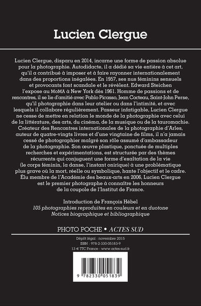 Lucien Clergue, disparu au mois de novembre 2014, incarne une forme de passion absolue pour la photographie. Il a dédié sa vie entière à cet art, qu'il a contribué à imposer et à faire rayonner internationalement dans des proportions inégalées. Élu membre de l'Académie des beaux-arts en 2006, il est le premier photographe à connaître les honneurs de la coupole de l'Institut de France. Auteur de soixante-quinze livres et d'une vingtaine de films courts et moyens métrages, créateur des Rencontres internationales de la photographie d'Arles, Lucien Clergue n'a jamais cessé de photographier malgré son rôle assumé d'ambassadeur de la photographie.