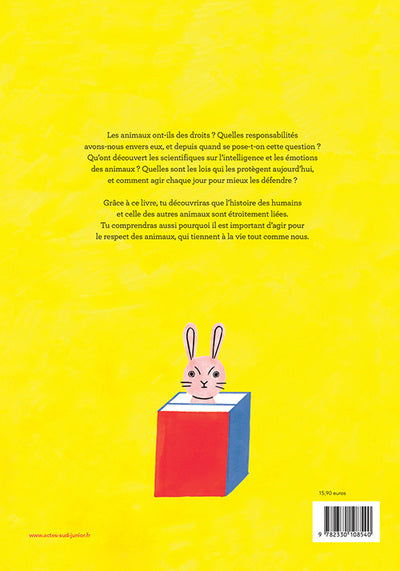 PrésentationLes animaux ont des droits, en premier lieu celui d'être respectés par les hommes. Malgré des avancées certaines dans les mentalités et dans les lois grâce au travail de nombreuses associations qui militent pour le droit animal, les abus envers les animaux sont encore fréquents ! L'homme préhistorique cherchait à se protéger des animaux, à survivre parmi eux. Au fil des siècles, il a pris le pouvoir sur l'ensemble du monde animal, domestiquant certaines espèces et en détruisant d'autres. Pourtant, les animaux ont des droits. Cette récente prise de conscience est en passe de modifier profondément les rapports entre l'humain et l'animal. Les éthologues, qui étudient les moeurs animales, ont montré que les animaux sont sensibles à la douleur, communiquent, sont capables de mentir, de rire, d'établir des stratégies... Pourtant, les conditions d'élevage sont encore trop souvent cruelles, de nombreuses expériences sont menées par des laboratoires sur des cobayes, de nombreuses menaces planent sur les espèces... Sous la pression des associations, les gouvernements commencent à prendre des mesures de protection, mais il reste beaucoup à faire ! Album soutenu à sa parution par l'association de défense des animaux L214.,4e de couvertureLes animaux ontdes droits, en premier lieu celui d'être respectés par les hommes. Malgré des avancées certaines dans les mentalités et dans les lois grâce au travail de nombreuses associations qui militent pour le droit animal, les abus envers les animaux sont encore fréquents ! L'homme préhistorique cherchait à se protéger des animaux, à survivre parmi eux. Au fil des siècles, il a pris le pouvoir sur l'ensemble du monde animal, domestiquant certaines espèces et en détruisant d'autres. Pourtant, les animaux ont des droits. Cette récente prise de conscience est en passe de modifier profondément les rapports entre l'humain et l'animal. Les éthologues, qui étudient les moeurs animales, ont montré que les animaux sont sensibles à la douleur, communiquent, sont capables de mentir, de rire, d'établir des stratégies... Pourtant, les conditions d'élevage sont encore trop souvent cruelles, de nombreuses expériences sont menées par des laboratoires sur des cobayes, de nombreuses menaces planent sur les espèces... Sous la pression des associations, les gouvernements commencent à prendre des mesures de protection, mais il restebeaucoup à faire ! Album soutenu à sa parution par l'association de défense des animaux L214. Afficher moinsAfficher plus