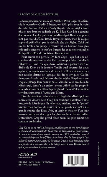 L’ancien procureur et maire de Natchez, Penn Cage, et sa fian­cée la journaliste Caitlin Masters, ont failli périr sous la main du riche homme d’affaires Brody Royal et de ses Aigles Bicé­phales, une branche radicale du Ku Klux Klan liée à certains des hommes les plus puissants du Mississippi. Ils ne sont pour­tant pas tirés d’affaire. Brody Royal est mort, mais le couple apprend qu’il n’était pas la véritable tête des Aigles. Celui qui tire les ficelles du groupe terroriste est un homme bien plus redoutable encore : le chef du Bureau des enquêtes criminelles de la police d’État de Louisiane, Forrest Knox.Pour sauver son père, le Dr Tom Cage – qui fuit une ac­cusation de meurtre et des flics corrompus bien décidés à l’abattre –, Penn n’a que deux solutions : pactiser avec ce diable de Knox ou le détruire. Tandis qu’il poursuit les deux options, sa fiancée continue de lever le voile sur des meurtres non résolus datant de l’époque des droits civiques. Caitlin tient peut­-être de quoi faire tomber les Aigles Bicéphales : son enquête plonge loin dans le passé, dans les eaux troubles du Mississippi, jusqu’à un endroit secret utilisé par les proprié­taires d’esclaves et le Klan depuis plus de deux siècles, un lieu terrifiant surnommé l’Arbre aux Morts.Dans le deuxième volet de cette trilogie du Mississippi en­tamée avec Brasier noir, Greg Iles continue d’explorer l’âme torturée de l’Amérique. Et le lecteur, médusé, voit la “petite” histoire d’un homme de justice et de ses proches se mêler à la grande épopée des États­-Unis, et venir en éclairer d’un jour nouveau certaines des pages les plus sombres. Par ce thriller tentaculaire, Greg Iles prend place parmi les plus ambitieux conteurs américains.Biographie de l'auteurGreg Iles est né en 1960 à Stuttgart, en Allemagne, où son père dirigeait la clinique de l’ambassade des États-Unis au plus fort de la Guerre froide. Il connut le succès dès son premier roman, en 1993, un thriller consacré au criminel de guerre Rudolf Hess. Il enchaîne alors les livres (dont un certain nombre publié aux Presses de la Cité et repris en poche) jusqu’à l’accident de voiture en 2011 qui manque de lui coûter la vie et dans lequel il perdra une jambe. Il s’attelle alors à la fameuse trilogie Natchez Burning, composé de Brasier noir, L’Arbre aux morts et Le Sang du Mississippi.