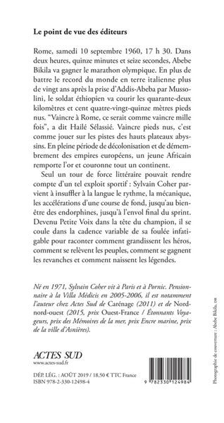 Rome, samedi 10 septembre 1960, 17 h 30. Dans deux heures, quinze minutes et seize secondes, Abebe Bikila va gagner le marathon olympique. En plus de battre le record du monde en terre italienne plus de vingt ans après la prise d’Addis-Abeba par Mussolini, le soldat éthiopien va courir les quarante-deux kilomètres et cent quatre-vingt-quinze mètres pieds nus. “Vaincre à Rome, ce serait comme vaincre mille fois”, a dit Hailé Sélassié. Vaincre pieds nus, c’est comme jouer sur les pistes des hauts plateaux abyssins. En pleine période de décolonisation et de démembrement des empires européens, un jeune Africain remporte l’or et couronne tout un continent.Seul un tour de force littéraire pouvait rendre compte d’un tel exploit sportif : Sylvain Coher parvient à insu?er à la langue le rythme, la mécanique, les accélérations d’une course de fond, jusqu’au bien-être des endorphines, jusqu’à l’envol ?nal du sprint. Devenu Petite Voix dans la tête du champion, il se coule dans la cadence variable de sa foulée infatigable pour raconter comment grandissent les héros, comment se relèvent les peuples, comment se gagnent les revanches et comment naissent les légendes.Biographie de l'auteurNé en 1971, Sylvain Coher vit à Paris et à Nantes, selon le vent et l'état de la mer. Après des études de lettres modernes, il a successivement été moniteur de voile, surveillant d'internat, libraire, éditeur, maçon et chômeur. Depuis 2001, il intervient lors de rencontres ou de lectures publiques et anime régulièrement des ateliers d'écriture. Pensionnaire à la Villa Médicis 2005-2006, il est l'auteur chez Actes Sud de Hors saison (Babel n°1071), Carénage (2011 ; Babel n°1199), Nord-nord-ouest (2015 ; Babel n°1461 ; prix Ouest-France / Étonnants Voyageurs, prix des Mémoires de la mer, prix Encre Marine, prix de la bille d'Asnières) et Trois cantates policières (2015).