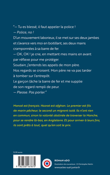 PrésentationLe père de Manoé est marin pêcheur à Calais. Un matin brumeux, alors qu'il conduit son fils au collège, une ombre apparaît dans le faisceau des phares de la voiture. S'ensuit un impact léger, mou, mais aucune trace de choc. Près de là, dans un terrain vague, Manoé tombe sur un garçon de son âge, blessé et en panique, qui le supplie de ne pas appeler les secours. C'est un de ces jeunes migrants prêts à prendre tous les risques pour passer en Angleterre. Manoé aussi veut se rendre là-bas. Pour d'autres raisons. Un peu pour assister à un match de foot, beaucoup pour y retrouver sa mère. Sur fond de grèves des pêcheurs et de trafics des passeurs, les deux adolescents s'apprivoisent et s'unissent pour récolter l'argent nécessaire à la traversée - qu'ils ne veulent pas être la dernière. C'est le récit d'une amitié imprévisible, soudée par un projet commun : traverser la Manche, quel qu'en soit le prix. LIRE UN EXTRAIT Afficher moinsAfficher plus