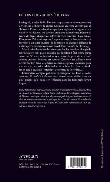 PrésentationLeningrad, années 1930. Plusieurs appartements communautaires deviennent le théâtre de crimes aux mises en scène excentriques et élaborées. Dans ces habitations spartiates typiques du régime communiste, les victimes, des citoyens ordinaires et anonymes, trônent au centre de décors chaque fois différents et extrêmement bien pensés. L'inspecteur Zaïtsev et sa petite équipe en charge de l'enquête doivent faire face à un autre mystère : la disparition de plusieurs tableaux de maîtres précieusement conservés dans l'illustre musée de l'Ermitage. Mais à peine les recherches commencées, les membres chargés de l'investigation sont passés au crible par la police d'État et une purge contre les éléments antisoviétiques est lancée. La paranoïa se répand comme un virus, l'ennemi est partout. Zaïtsev et ses collègues vont devoir fouiller dans les affaires des hautes sphères étatiques pour retrouver le meurtrier. Mais Staline tient l'empire d'une main de fer, et gare à ceux qui tenteraient de contredire les ordres... Entremêlant complot politique et corruption sur fond de toiles dérobées, Et soudain le chasseur sortit du bois est un thriller d'autant plus glaçant qu'il puise son efficacité dans les faits réels l'ayant inspiré. Afficher moinsAfficher plus