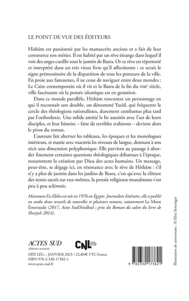Dans son roman, Mansoura Ez-Eldin mêle les destinées de Hishâm, marchand de manuscrits au Caire, et de Yazîd, théologien à Basra au VIIIe siècle. Entre réalité et rêverie, les deux mondes se répondent, tandis que des questions sur la pensée, la religion et l'amitié se soulèvent. Hishâm devra affronter les trahisons dans le cercle des rationalistes, tandis que le rêve prémonitoire des anges et du jasmin plane sur son destin. Une fresque polyphonique où se mêlent l'histoire, la fiction et la réflexion. Afficher moinsAfficher plus