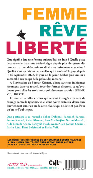 PrésentationQue signifie être une femme aujourd'hui en Iran ? Quelle place occupe-t-elle dans une société régie depuis plus de quatre décennies par une théocratie totalitaire exclusivement masculine ? Quelles sont les raisons de la colère qui a embrasé le pays depuis le 16 septembre 2022, le jour où la jeune Mahsa Jina Amini a succombé aux coups de la police des moeurs ? À l'invitation de Sorour Kasmaï, douze autrices iraniennes racontent dans ce recueil, sous des formes diverses, ce qu'évoquent pour elles les trois mots qui résonnent depuis : FEMME, VIE, LIBERTÉ. En soutien à celles et ceux qui se sont insurgés avec tant de courage contre la tyrannie, voici donc douze histoires, douze voix qui viennent s'unir au cri de cette révolte qui ne s'éteint pas. Pour qu'on ne l'oublie pas. Ont participé à ce recueil : Sahar Delijani, Fahimeh Farsaie, Sorour Kasmaï, Zahra Khanloo, Azar Mahloujian, Nasim Marashi, Aida Moradi Ahani, Bahiyyih Nakhjavani, Asieh Nezam Shahidi, Parisa Reza, Rana Soleimani et Fariba Vafi. Les bénéfices des ventes de cet ouvrage seront reversés à une association.,4e de couvertureQue signifie être une femme aujourd'hui en Iran ? Quelle place occupe-t-elle dans une société régie depuis plus de quatre décennies par une théocratie totalitaire exclusivement masculine ? Quelles sontles raisons de la colère qui a embrasé le pays depuis le 16 septembre 2022, le jour où la jeune Mahsa Jina Amini a succombé aux coups de la police des moeurs ? À l'invitation de Sorour Kasmaï, douze autrices iraniennes racontent dans ce recueil, sous des formes diverses, ce qu'évoquent pour elles les trois mots qui résonnent depuis : FEMME, VIE, LIBERTÉ. En soutien à celles et ceux qui se sont insurgés avec tant de courage contre la tyrannie, voici donc douze histoires, douze voix qui viennent s'unir au cri de cette révolte qui ne s'éteint pas. Pour qu'on ne l'oublie pas. Ont participé à ce recueil : Sahar Delijani, Fahimeh Farsaie, Sorour Kasmaï, Zahra Khanloo, Azar Mahloujian, Nasim Marashi, Aida Moradi Ahani, Bahiyyih Nakhjavani, Asieh Nezam Shahidi, Parisa Reza, Rana Soleimani et Fariba Vafi. Les bénéfices des ventes de cet ouvrage seront reversés à une association. Afficher moinsAfficher plus