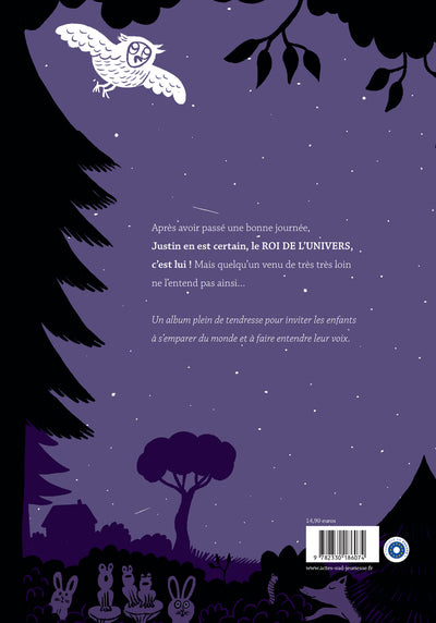 PrésentationAprès avoir passé une bonne journée, Justin se couche heureux, il en est persuadé : le roi de l'univers, c'est lui ! Mais à peine endormi, il est réveillé en sursaut par un vaisseau spatial qui s'est posé au milieu de son jardin. Un petit garçon qui vient de la planète Trucmuche Machin Machin le cherche : il lui annonce qu'en fait c'est lui, le roi de l'univers ! Et deux rois sur le même trône, ça n'est pas possible, il faut choisir. Après avoir envisagé de multiples solutions, Justin trouve enfin la bonne idée, que tous les enfants fassent entendre leur voix en devenant les rois et les reines de leur bout d'univers. LIRE UN EXTRAIT Afficher moinsAfficher plus