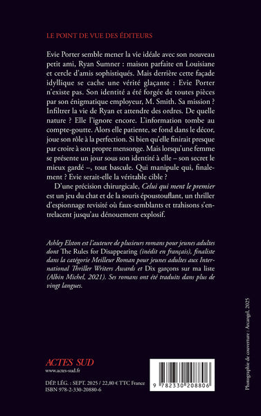 PrésentationEvie Porter a tout pour elle. Une belle maison, un petit ami parfait, des amis sophistiqués. Une vie de rêve. Seulement, Evie Porter n'existe pas. Son identité a été inventée de toutes pièces par son mystérieux patron, Mr. Smith. Sa mission : s'infiltrer dans la vie de Ryan Sumner et attendre de nouveaux ordres. Mais lorsqu'une femme se présente un jour sous sa véritable identité - son secret le mieux gardé -, tout bascule. Qui manipule qui, finalement ? Serait-ce en réalité Evie, la cible ? D'une précision chirurgicale, Ashley Elston manipule brillamment son lecteur dans ce thriller d'espionnage revisité où faux-semblants et trahisons s'entrelacent pour un dénouement aussi surprenant qu'implacable. Afficher moinsAfficher plus
