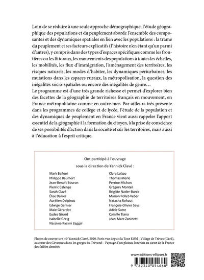 Présentation Loin de se réduire à une seule approche démographique, l’étude géographique des populations et du peuplement aborde l’ensemble des composantes et des dynamiques spatiales en lien avec les populations : la trame du peuplement et ses facteurs explicatifs (l’histoire n’en étant qu’un parmi d’autres), y compris dans des types d’espaces spécifiques comme les frontières ou les littoraux, les mouvements des populations à toutes les échelles, les mobilités, les flux d’immigration, l’aménagement des territoires, les risques naturels, les modes d’habiter, les dynamiques périurbaines, les mutations dans les espaces ruraux, la métropolisation, la question des inégalités socio-spatiales ou encore des inégalités de genre… Le programme est d’une très grande richesse et permet d’explorer bien des facettes de la géographie de territoires français en mouvement, en France comme en outre-mer. Par ailleurs très présente dans les programmes de collège et de lycée, l’étude de la population et des dynamiques de peuplement en France vient aussi rappeler l’apport essentiel de la géographie à la formation du citoyen, à la prise de conscience de ses possibilités d’action dans la société et sur les territoires, mais aussi à l’éducation à l’esprit critique. Afficher moinsAfficher plus