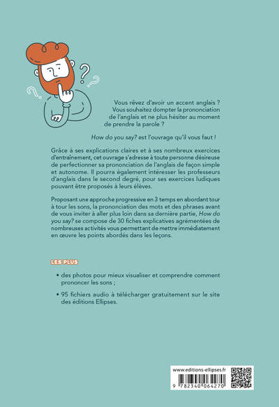 Ce livre s'adresse à toute personne (élèves, étudiants, adultes) souhaitant de façon simple, autonome et active, améliorer sa prononciation en anglais, mieux en comprendre les règles et se perfectionner. Riche de nombreuses activités variées, il sera également utile aux enseignants à la recherche d’exercices ludiques pouvant être repris en classe. Il propose : 30 fiches explicatives agrémentées de nombreux exercices d’entraînement corrigés (répétition, reconnaissance de sons, virelangues…) pour permettre de mettre en œuvre sans attendre les connaissances et compétences phonologiques présentées. 95 fichiers audio à télécharger gratuitement sur le site des éditions Ellipses. Afficher moinsAfficher plus