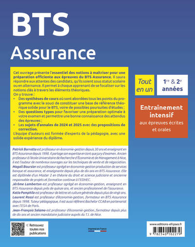 Note biographique Patrick Barrottaest professeur d’économie et gestion. Il enseigne de la seconde au BTS, maiségalement en Licence 3 et Master 1à l’IUP de Nice. Laurent Rossiest professeur d’économie et gestion et formateur BTS. ,Présentation Cet ouvrage présente l’essentiel des notions à maitriser pour une préparation efficiente aux épreuves du BTS Assurance. Il saura répondre aux attentes des candidats, qu’ils soient sous statut scolaire ou en alternance. Il permet à chaque apprenant de se focaliser sur les notions clés à travers les éléments théoriques. On y trouve : Dessynthèses de coursoù sont abordés tous les points du programme avec le souci de constituer une base de référence théorique solide pour le BTS, voire de possibles poursuites d’études ;Desquestions typespour favoriser une préparation optimale à votre examen et permettre une bonne connaissance des attendus des épreuves ;Lessujets d’annalesde 2024 et 2025avec despropositions decorrection. L’équipe d’auteurs est formée d’experts de la pédagogie, avec une solide expérience du diplôme. Afficher moinsAfficher plus