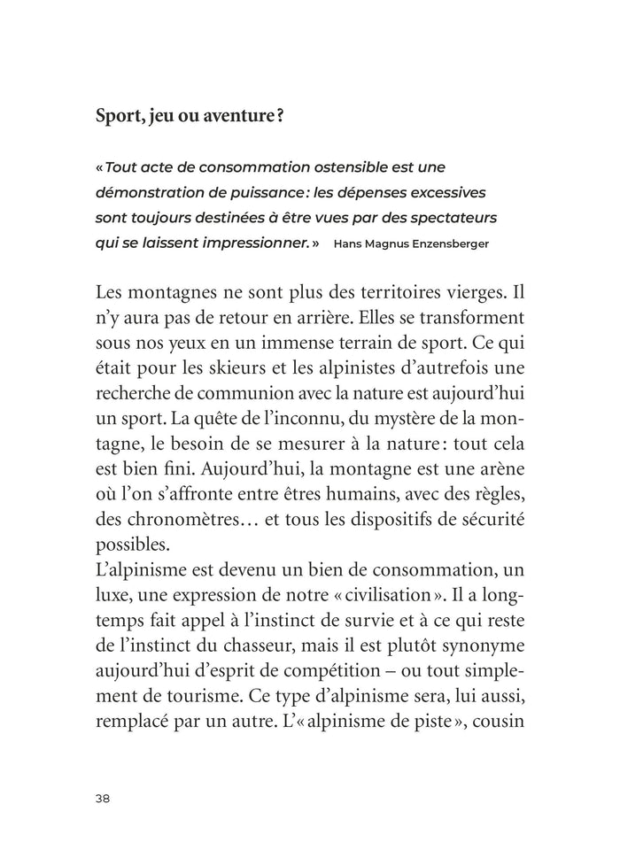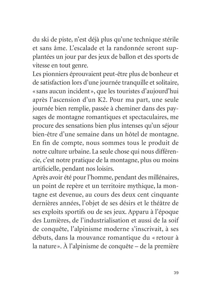 Présentation Dans un manifeste saisissant, le grand alpiniste Reinhold Messner lance un appel en faveur de la préservation de la nature en montagne. Parce qu’il y a urgence. Fonte des glaciers,éboulements monstrueux, manque d’enneigement… depuis quelques années, le réchauffement climatique se fait particulièrement sentir en montagne. Par ailleurs, en quelques décennies, cetécosystème aété fragilisé par de nombreux aménagements touristiques. Aujourd’hui, des régions de montagne entières sont devenues des terrains de jeu, plus proches du parc d’attractions que de l’espace sauvage. Le tourisme de masse, avec ses parkings, ses remontées mécaniques et ses routes, menace la nature autrefois unique et vierge des montagnes.  Qui mieux que Reinhold Messner, alpiniste charismatique, pouvaitécrire ce manifeste en faveur du maintien de la nature sauvage en montagne ? Le premier hommeà avoir gravi les quatorze sommets de plus de 8 000 mètres,écologiste engagé, plaide pour une interaction durable et raisonnable avec le paysage culturel alpin et appelle chacun d’entre nousà protéger les montagnes afin que nous puissionsà l’avenir faire l’expérience de leurétat naturel. Son credo : la seule montagne qui vaille la peine qu’on la gravisse, c’est une montagne intacte. D’une voix forte, Reinhold Messner montre que nous partageons tous la responsabilité de la survie de ce paysage. Ce n’est qu’en changeant notre mode de vie que nous pourrons sauver les montagnes de leur disparition. Un constat qui peutêtre faità l’échelle de la planète. Afficher moinsAfficher plus