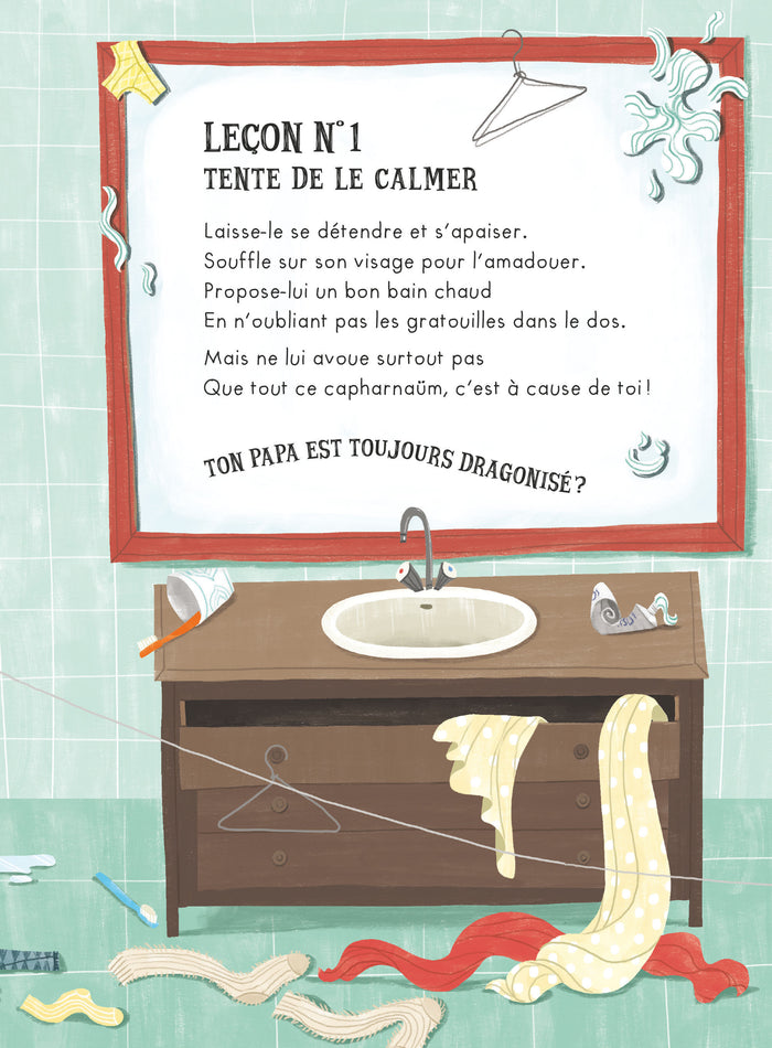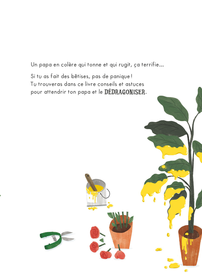 Dans cet album jeunesse, un enfant doit gérer un papa transformé en dragon en colère. Un guide en dix leçons est proposé pour aider l'enfant à calmer son père et apaiser la situation. Les astuces sont mises en œuvre de manière humoristique et touchante, laissant planer le doute sur leur efficacité. Une histoire tendre abordant la relation père-enfant et la gestion des émotions, à lire ensemble à partir de 3 ans. Afficher moinsAfficher plus