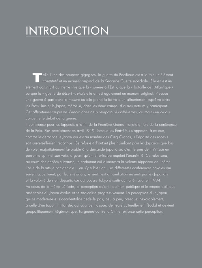 Présentation De Pearl Harborà Nagasaki Du mois de décembre 1941à celui d’août 1945, les Alliés, principalement les Américains, et les Japonais s'affrontent dans une guerre dont la caractéristique principale est de se dérouler sur le plus grand espace marin de la planète qu'est l'océan Pacifique. Plus de 8 000 km ne séparent-ils pas Tokyo de San Francisco ? Et si la base de Pearl Harbour, dans lesîles Hawaï, ne se situe qu’à quelque 4 000 km des côtes américaines, les grandes batailles aéronavales et terrestres se dérouleront comme celle de Guadalcanal dans lesîles Salomon, encore 6 000 km plus loin. Quant aux Japonais, les distances qu'ils aurontà franchir seront souvent presqueéquivalentes puisque plus de 5 500 km séparent Tokyo de de Guadalcanal. Mais pourquoi une telle guerre et tant de batailles si loin de« chez soi » ? Parce que les Japonais entendent construire autour d'eux un immense empire qu’ils baptisent« Sphère de coprospérité ». Une sphère de coprospérité qui s'étendrait de la Chine sur le continent aux Indes néerlandaises en direction de l'Australie. Pour y parvenir il faut rendre toute intervention américaine impossible en détruisant sa flotte du Pacifique. En cas d'échec, le pire està redouter et l’état-major impérial nippon le sait. Or l'attaque contre Pearl Harbor, petit succès tactiqueévident pour le Japon, est surtout pour lui… une grande défaite stratégique. Pour une raison simple, les porte-avions américains et les principales installations portuaires sont demeurés intacts. Dès lors et jusqu'en 1945, le rapport des forces va,car il ne peut, qu’évoluer en faveur desÉtats-Unis dont la puissanceéconomique et industrielle est dix fois supérieureà celle du Japon. Mais il faudra, pour y parvenir 4 années de guerre, accompagnées d'un bilan humain et matériel terrifiant. Un bilan dont la dernière ligne seraécrite les 6 et 9 août 1945 lorsque 2 bombes atomiques seront larguées sur les villes japonaises d'Hiroshima et de Nagasaki, faisant entrer la guerre et l'humanité dans uneère nouvelle. Celle de l’Apocalypse nucléaire ! Afficher moinsAfficher plus