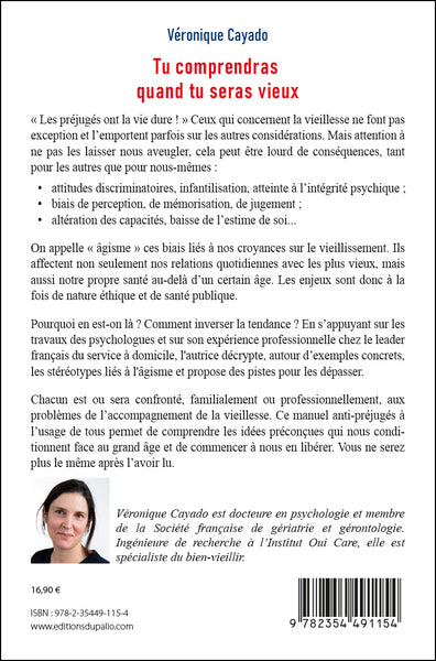 Présentation« Les préjugés ont la vie dure ! » Ceux qui concernent la vieillesse ne font pas exception et l’emportent parfois sur les autres considérations. Mais attention à ne pas les laisser nous aveugler, cela peut être lourd de conséquences, tant pour les autres que pour nous-mêmes : - attitudes discriminatoires, infantilisation, atteinte à l’intégrité psychique ; - biais de perception, de mémorisation, de jugement ; - altération des capacités, baisse de l’estime de soi... On appelle « âgisme » ces biais liés à nos croyances sur le vieillissement. Ils affectent non seulement nos relations quotidiennes avec les plus vieux, mais aussi notre propre santé au-delà d’un certain âge. Les enjeux sont donc à la fois de nature éthique et de santé publique. Pourquoi en est-on là ? Comment inverser la tendance ? En s’appuyant sur les travaux des psychologues et sur son expérience professionnelle chez le leader français du service à domicile, l'autrice décrypte, autour d’exemples concrets, les stéréotypes liés à l'âgisme et propose des pistes pour les dépasser. Chacun est ou sera confronté, familialement ou professionnellement, aux problèmes de l’accompagnement de la vieillesse. Ce manuel anti-préjugés à l’usage de tous permet de comprendre les idées préconçues qui nous conditionnent face au grand âge et de commencer à nous en libérer. Vous ne serez plus le même après l’avoir lu. Véronique Cayado est docteure en psychologie et membre de la Société française de gériatrie et gérontologie. Ingénieure de recherche à l’Institut Oui Care, elle est spécialiste du bien vieillir. Afficher moinsAfficher plus