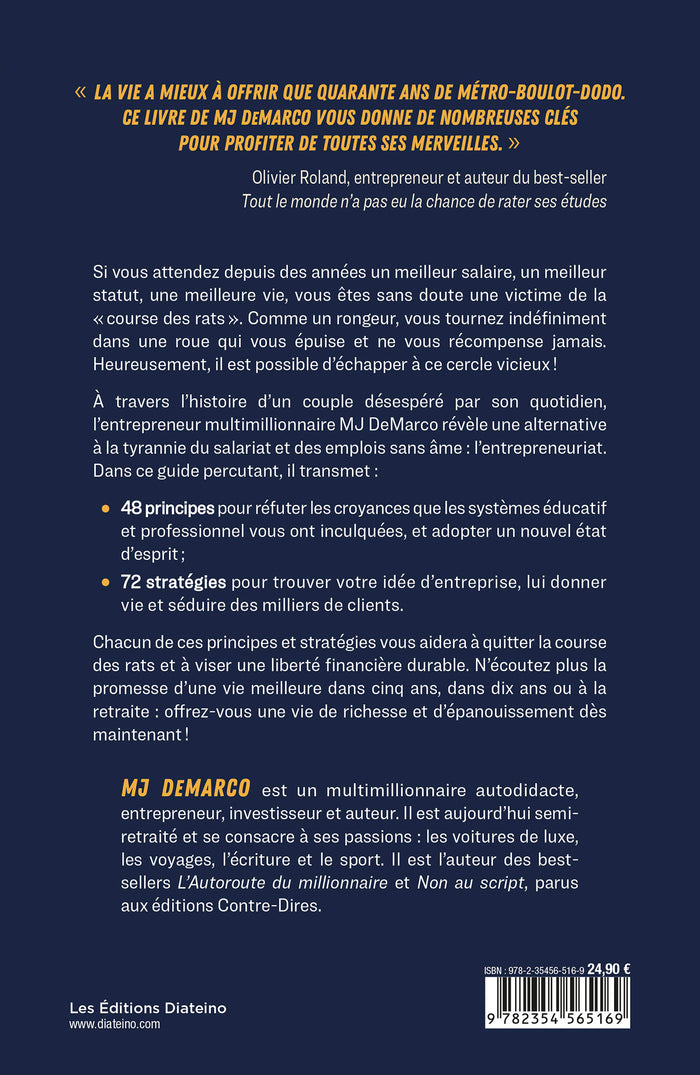 Si vous attendez depuis des années un meilleur salaire, un meilleur statut, une meilleure vie, vous êtes sans doute une victime de la " course des rats ". Comme un rongeur, vous tournez indéfiniment dans une roue qui vous épuise et ne vous récompense jamais. Heureusement, il est possible d'échapper à ce cercle vicieux ! À travers l'histoire d'un couple désespéré par son quotidien, l'entrepreneur multimillionnaire MJ DeMarco révèle une alternative à la tyrannie du salariat et des emplois sans âme : l'entrepreneuriat. Dans ce guide percutant, il transmet : 48 principes pour réfuter les croyances que les systèmes éducatif et professionnel vous ont inculquées, et adopter un nouvel état d'esprit ; 72 stratég... Afficher moinsAfficher plus