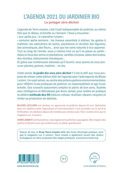 Présentation Le compagnon indispensable du jardinier bio ! Jour après jour, il indique le calendrier lunaire, les travaux essentiels à réaliser, les gestes à accomplir. Le jardinier y notera les informations indispensables à la conduite de son jardin : dates et endroits des semis et plantations, variétés choisies, dates des levées, des récoltes, événements climatiques… Avec de nombreuses adresses pour se procurer plantes, graines, matériel… en bio. Cette édition 2021 propose aux jardiniers écoresponsables une marche à suivre méthodique pour atteindre au potager l’objectif zéro déchet ! ,Note promotionnelle Le premier agenda du jardinier bio Zéro déchet !  ,Présentation Le premier agenda du jardinier bio Zéro déchet !  Le compagnon indispensable du jardinier bio ! Jour après jour, il indique le calendrier lunaire, les travaux essentiels à réaliser, les gestes à accomplir. Le jardinier y notera les informations indispensables à la conduite de son jardin : dates et endroits des semis et plantations, variétés choisies, dates des levées, des récoltes, événements climatiques… Avec de nombreuses adresses pour se procurer plantes, graines, matériel… en bio. Afficher moinsAfficher plus
