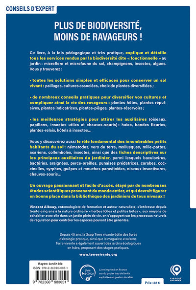 Présentation Toutes les explications techniques et les solutions pratiques pour comprendre l’utilité d’attirer au potager ou au jardin d’ornement les auxiliaires (insectes, oiseaux), si indispensables pour lutter naturellement contre les ravageurs (sol vivant, paillage, cultures associées, engrais verts…). Un livre facile d’accès, passionnant, riche de conseils pratiques, qui devrait figurer en bonne place dans la bibliothèque des jardiniers de tous niveaux ! ,PrésentationComment accueillir la biodiversité au jardin, avec à la clé une diminution naturelle des ravageurs. Toutes les explications techniques et les solutions pratiques pour comprendre l’utilité d’attirer au potager ou au jardin d’ornement les auxiliaires (insectes, oiseaux), si indispensables pour lutter naturellement contre les ravageurs (sol vivant, paillage, cultures associées, engrais verts…). Un livre facile d’accès, passionnant, riche de conseils pratiques, qui devrait figurer en bonne place dans la bibliothèque des jardiniers de tous niveaux !,Note promotionnelleComment accueillir la biodiversité au jardin, avec à la clé une diminution naturelle des ravageurs. Afficher moinsAfficher plus
