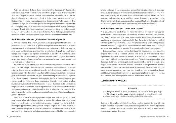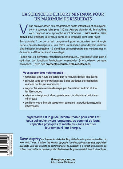En bref LA SCIENCE DE L’EFFORT MINIMUM POUR UN MAXIMUM DE RÉSULTATS ,Présentation LA SCIENCE DE L’EFFORT MINIMUM POUR UN MAXIMUM DE RÉSULTATS Vous en avez assez des programmes santé intenables et des injonctions à toujours faire plus ? Dave Asprey, pionnier du biohacking, vous propose une approche révolutionnaire :faire moins,mais mieux, pour atteindre la forme, la santé et la longévité dont vous rêvez. Son postulat ? Le corps est programmé pour économiser son énergie. Cette « paresse biologique », loin d’être un handicap, peut devenir un levier d’optimisation redoutable – à condition de comprendre ses mécanismes et de savoir la détourner à votre avantage. Fondé sur les dernières recherches scientifiques,Hyper santévous aide à optimiser vos fonctions biologiques essentielles (métabolisme, cerveau, hormones…) avec des protocoles courts, ciblés et efficaces. Vous apprendrez notamment à : remplacer une heure de cardio par 10 minutes d’eff ort intelligent ;stimuler votre concentration grâce à des pratiques de respiration validées par les neurosciences ;augmenter votre niveau d’énergie par l’exposition au froid et à la lumière rouge ;relancer votre pouvoir d’autoguérison en comblant vos déficits en minéraux ;améliorer votre énergie sexuelle en stimulant la production naturelle d’hormones. Hyper santéest le guide incontournable pour celles et ceux qui veulent vivre longtemps, au sommet de leurs capacités physiques et mentales – sans sacrifier leur temps ni leur énergie. Afficher moinsAfficher plus