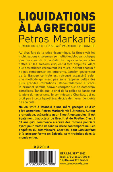 PrésentationAu plus fort de la crise économique, la Grèce voit les mobilisations citoyennes se multiplier, bloquant chaque jour les rues de la capitale. Le pays croule sous les dettes et les salaires risquent d'être amputés. Alors que des affiches recouvrent les murs, incitant chacun à ne pas rembourser ses emprunts, l'ancien gouverneur de la Banque centrale est retrouvé assassiné selon une méthode qui n'est pas sans rappeler celles des plus grandes révolutions. Redoutablement efficace, le criminel semble pouvoir compter sur de nombreux complices. Tandis que le chef de la police se lance sur la piste du terrorisme, le commissaire Charitos, qui ne croit pas à cette hypothèse, décide de mener l'enquête de son côté. Afficher moinsAfficher plus