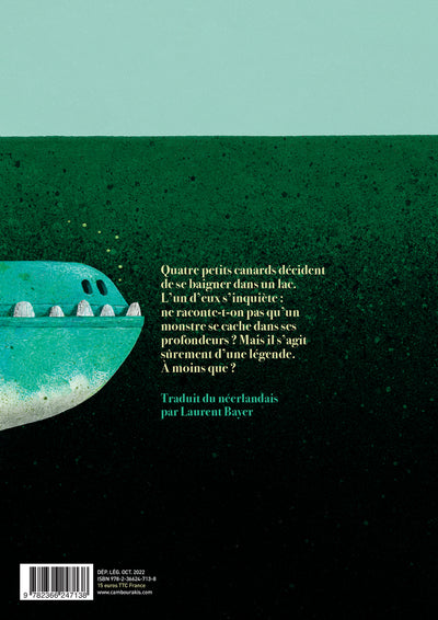PrésentationQuatre petits canards décident de se baigner dans un lac. L'un d'eux s'inquiète : ne raconte-t-on pas qu'un monstre se cache dans ses profondeurs ? Mais il s'agit sûrement d'une légende. À moins que ? Afficher moinsAfficher plus