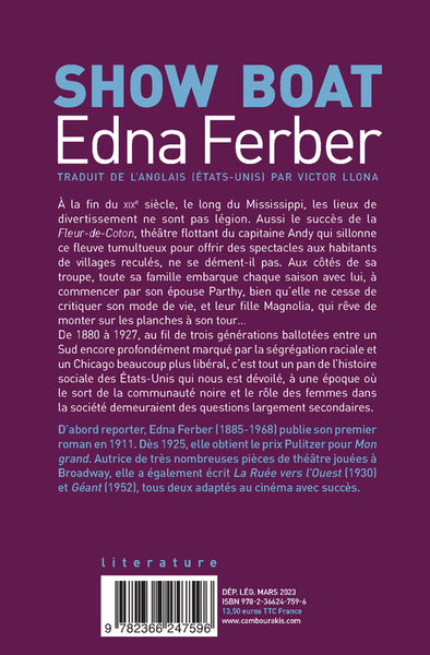 Publié en 1926, "Show Boat" d'Edna Ferber est un roman classique de la littérature américaine. L'histoire se déroule de 1880 à 1927 le long du Mississippi, et suit la famille du capitaine Andy, propriétaire d'un théâtre flottant. Sa fille Magnolia rêve de devenir une artiste, tandis que la communauté noire et les femmes doivent faire face aux préjugés de l'époque. Ce roman explore les thèmes de la race, du genre et de la famille dans l'Amérique du Sud et du Nord. Afficher moinsAfficher plus