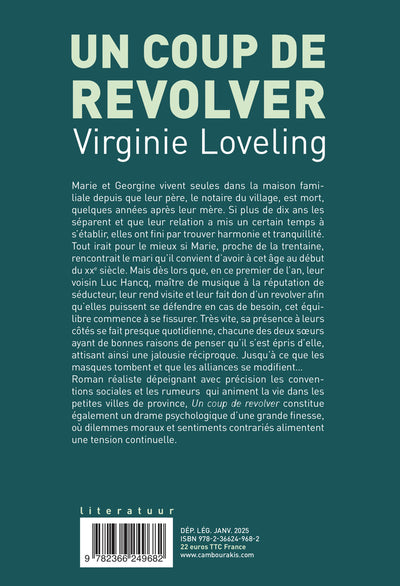 Marie et Georgine vivent seules dans la maison familiale depuis que leur père, le notaire du village, est mort, quelques années après leur mère. Si plus de dix ans les séparent et que leur relation a mis un certain temps à s'établir, elles ont fini par trouver harmonie et tranquillité. Tout irait pour le mieux si Marie, proche de la trentaine, rencontrait le mari qu'il convient d'avoir à cet âge au début du xxe siècle. Mais dès lors que, en ce premier de l'an, leur voisin Luc Hancq, maître de musique à la réputation de séducteur, leur rend visite et leur fait don d'un revolver afin qu'elles puissent se défendre en cas de besoin, cet équilibre commence à se fissurer. Très vite, sa présence à leurs côtés se fait presque quotidienne, chacune des deux soeurs ayant de bonnes raisons de penser qu'il s'est épris d'elle, attisant ainsi une jalousie réciproque. Jusqu'à ce que les masques tombent et que les alliances se modifient... Roman réaliste dépeignant avec précision les conventions sociales et les rumeurs qui animent la vie dans les petites villes de province, Un coup de revolver constitue également un drame psychologique d'une grande finesse, où dilemmes moraux et sentiments contrariés alimentent une tension continuelle. Afficher moinsAfficher plus