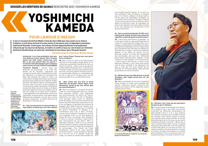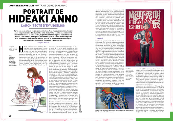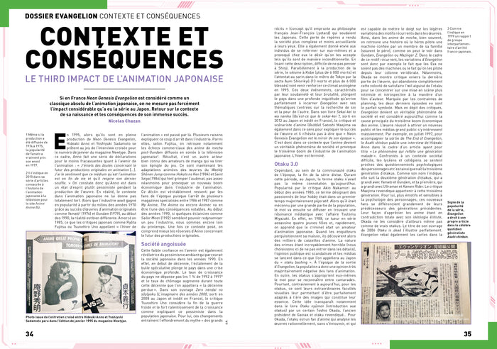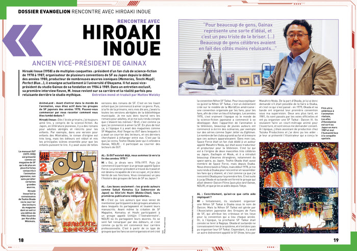 PrésentationAnimeLand fête les 30 ans de l'incontournable saga Neon Genesis Evangelion ! Pour ce numéro d'exception,le magazine donne la parole aux artistes phares de la sagaavecKazuya Tsurumaki(réalisateur),Yoji Enokido(scénariste),Mahiro Maeda(animateur, designer),Yusuke Matsui(animateur 3D) etYoko Takahashi(chanteuse de l'opening). Un portrait du créateurHideaki Anno(onétaità son exposition au Japon !) ainsi qu'une large documentation sur le contexte de la série et ses répercussions sur l'industrie vous permettront de tout savoir sur Eva, la saga qui a révolutionné les anime de robot au milieu des années 1990 Et ce n'est pas tout ! Afin de mieux comprendre la naissance et la production de cet animé culte,AnimeLand dresse un historique du premier studio d'Evangelion, Gainax. Grâceà un entretien inédit avec son ancien vice-présidentHiroaki Inoue, découvrez la vérité derrière cette industrie pas toujours reluisante... Enfin, AnimeLand poursuit cette influence de Gainax enévoquant le studio Trigger (Kill la Kill, Gurren Lagann) mais aussi par une interview de l'animateurYoshimichi Kameda(FMA, One Punch Man), grand fan deHiroyuki Imaishi, l'ancienne star de Gainax et fondateur de Trigger. Pour finir, un large entretien avecTakeshi Koike(réalisateur de Redline et du dernier film Lupin III) mais aussi un hommageàÉric Legrand(la voix de Seiya et Végéta) achèvent un numéro d'une grande richesse. Afficher moinsAfficher plus