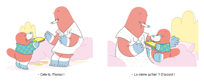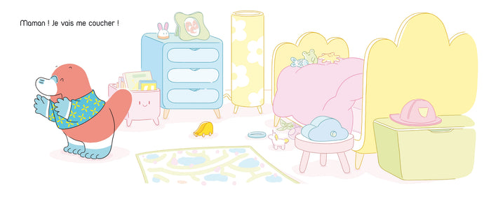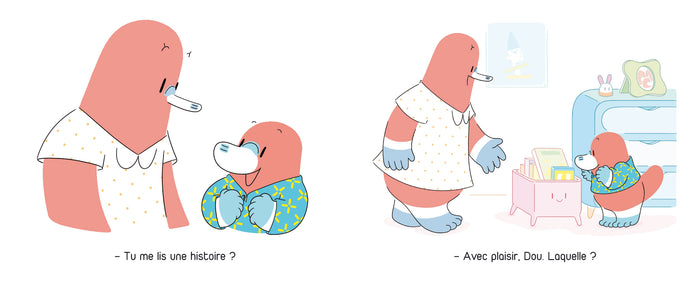 PrésentationPas besoin de le lui demander : ce soir, Dou a décidé tout seul de se coucher ! Ses jouets sont rangés (en tas sous le lit), il n'attend plus que l'histoire du soir pour s'endormir. Laquelle ? Mais la même qu'hier, bien sûr ! Avec Maman, le bébé ornithorynque accomplit tout le rituel du coucher : une histoire, une chanson, un pipi, un petit verre d'eau, la lumière du couloir pour ne pas avoir peur, un câlin et bien sûr, son doudou !Ça y est ! Dou est prêt ! Vraiment ? Pas encore : il faut d'abord tout recommencer... avec Papa cette fois ! Afficher moinsAfficher plus