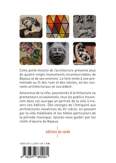 PrésentationCette petite histoire de l’architecture présente plus de quatre-vingts monuments incontournables de Bayeux et de ses environs. Le livre invite à une promenade au fil des rues et des siècles, où les courants architecturaux se succèdent. Amoureux de la ville, passionnés d’architecture ou promeneurs occasionnels, tous les publics trouveront dans cet ouvrage un portrait de la ville à travers ses édifices. Des vestiges de l'Antiquité aux architectures novatrices du XXe siècle, en passant par la ville médiévale et les hôtels particuliers de la période classique, laissez-vous guider par les chefs-d’œuvre de Bayeux.,Commentairesliste des architectes : Adrien de Bellaigues, Denis et Eugène Bühler, Brian K. Chamberlain, Jean-Côme Chilou, Gabriel Crétin, Didier Debarge, DVM architectes, Pal Henry Engh, John Harbeson, Lars Haukeland, Hough, Philippe Lasser, Henri Leboullanger, Christian Le Conte, Edouard Le Forestier, Guy Lemerr, Livingston&Larson, François Mansart, Léon Marcotte, Jacques Millet, Jacques Moussard, Alexandre Noget-Lacoudre, Geneviève Noirot, Jean-Pierre Renault, Eustache Restout, David Serero, SmithGroupJJR.,Commentairesà l'intérieur : Augustodurum, thermes, rempart gallo-romain, la ville au Moyen âge, église Saint-Loup, tapisserie de Bayeux, cathédrale Notre-Dame, crypte de la cathédrale, décor des arcades, prieuré Saint-Vigor, cheminée dite « lanterne des morts », chapelle de l’ancien séminaire, dépôt lapidaire, salle du chapitre, bibliothèque du chapitre, château fort de Creully, maison canoniale, maisons à pans de bois, clocher de l’église Saint-Patrice, chapelle palatiale, château de Fontaine-Henry, hôtel Louis XIII, hôtels particuliers, château de Balleroy, château de Brécy, ferme manoir de Cremel, enduits à la mignonnette, grand séminaire, couvent de la Charité, Hôtel-Dieu, abbaye St-Martin de Mondaye, hôtel du Doyen, palais épiscopal, hôtel Tardif, ancien monastère des Bénédictines, poste de vigie de l’Aure, halle aux poissons, gare, jardin botanique, monastère des Bénédictines, sous-préfecture, dôme de la cathédrale, chapelle de la Miséricorde, séminaire de Sommervieu, musée de la mine Littry, salle des audiences, auto-garage, villa Denage, le Vêtement Moderne, immeuble Art déco, blockhaus, batterie de Longues-sur-mer, port artificiel d’Arromanches, cimetière militaire britanique, cimetière militaire allemand, cimetière militaire américain, musée mémorial, cinéma Arromanches 360, centre Juno Beach, extension de l’hôpital, overlord museum, médiathèque. Afficher moinsAfficher plus