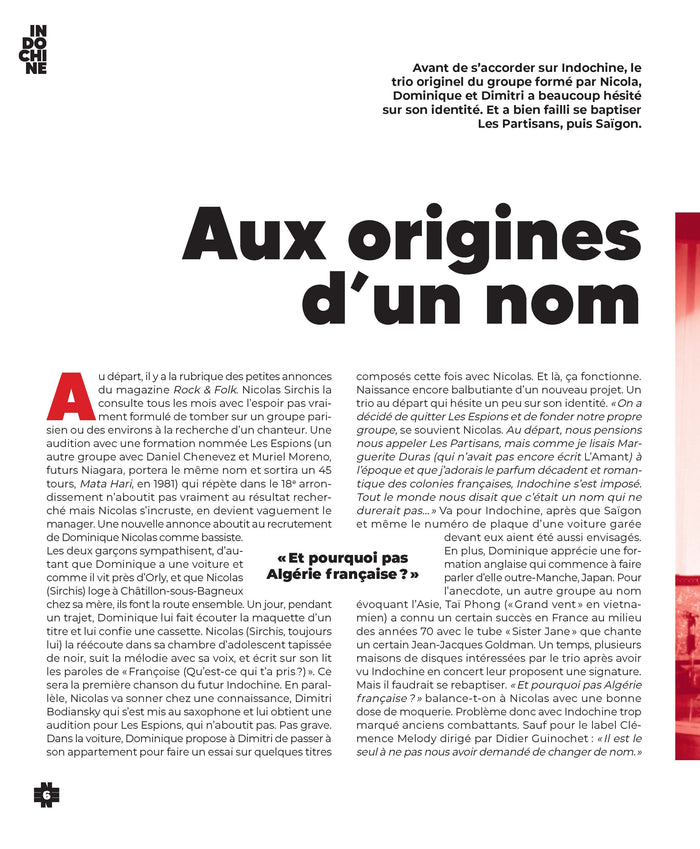 Indochine est l'un des groupes de rock français les plus emblématiques, ayant su traverser plus de 40 ans de carrière en se renouvelant sans cesse. Frédérick Rapilly, journaliste rock, retrace dans cet ouvrage les années de dissidence et d'indépendance du groupe, à travers une discographie riche en influences sonores et prises de position radicales. De leurs débuts à leurs plus grands succès, en passant par les rivalités et les luttes internes, plongez dans l'univers fascinant de ce groupe culte.