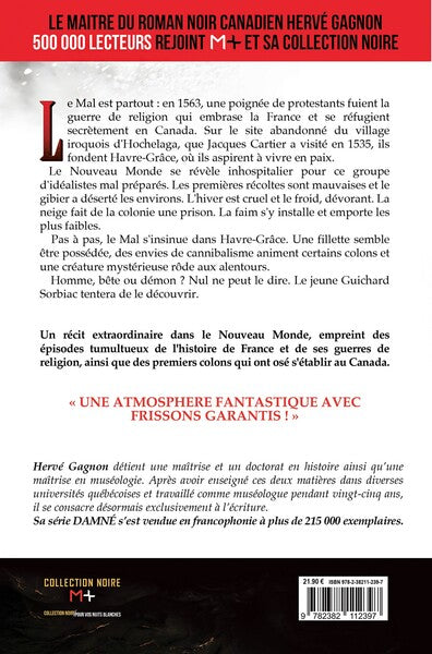 PrésentationLe Mal est partout : en 1563, une poignée de protestants fuient la guerre de religion qui embrase la France et se réfugient secrètement en Canada. Sur le site abandonné du village iroquois d'Hochelaga, que Jacques Cartier a visité en 1535, ils fondent Havre-Grâce, où ils aspirent à vivre en paix. Le Nouveau Monde se révèle inhospitalier pour ce groupe d'idéalistes mal préparés. Les premières récoltes sont mauvaises et le gibier a déserté les environs. L'hiver est cruel et le froid, dévorant. La neige fait de la colonie une prison. La faim s'y installe et emporte les plus faibles. Pas à pas, le Mal s'insinue dans Havre-Grâce. Une fillette semble être possédée, des envies de cannibalisme animent certains colons et une créature mystérieuse rôde aux alentours. Homme, bête ou démon ? Nul ne peut le dire. Le jeune Guichard Sorbiac tentera de le découvrir. Un récit extraordinaire dans le Nouveau Monde, empreint des épisodes tumultueux de l'histoire de France et de ses guerres de religion, ainsi que des premiers colons qui ont osé s'établir au Canada. « UNE ATMOSPHERE FANTASTIQUE AVEC FRISSONS GARANTIS ! » Hervé Gagnondétient une maîtrise et un doctorat en histoire ainsi qu’une maîtrise en muséologie. Après avoir enseigné ces deux matières dans diverses universités québécoises et travaillé comme muséologue pendant vingt-cinq ans, il se consacre désormais exclusivement à l’écriture. + Sa série DAMNÉ s’est vendue en francophonie à plus de 215 000 exemplaires. ,4e de couvertureLe Mal est partout : en 1563, une poignée de protestants fuient la guerre de religion qui embrase la France et se réfugient secrètement en Canada. Sur le site abandonné du village iroquois d'Hochelaga, que Jacques Cartier a visité en 1535, ils fondent Havre-Grâce, où ils aspirent à vivre en paix. Le Nouveau Monde se révèle inhospitalier pour ce groupe d'idéalistes mal préparés. Les premières récoltes sont mauvaises et le gibier a déserté les environs. L'hiver est cruel et le froid, dévorant. La neige fait de la colonie une prison. La faim s'y installe et emporte les plus faibles. Pas à pas, le Mal s'insinue dans Havre-Grâce. Une fillette semble être possédée, des envies de cannibalisme animent certains colons et une créature mystérieuse rôde aux alentours. Homme, bête ou démon ? Nul ne peut le dire. Le jeune Guichard Sorbiac tentera de le découvrir. Un récit extraordinaire dans le Nouveau Monde, empreint des épisodes tumultueux de l'histoire de France et de ses guerres de religion, ainsi que des premiers colons qui ont osé s'établir au Canada. « UNE ATMOSPHERE FANTASTIQUE AVEC FRISSONS GARANTIS ! » Hervé Gagnondétient une maîtrise et un doctorat en histoire ainsi qu’une maîtrise en muséologie. Après avoir enseigné ces deux matières dans diverses universités québécoises et travaillé comme muséologue pendant vingt-cinq ans, il se consacre désormais exclusivement à l’écriture. + Sa série DAMNÉ s’est vendue en francophonie à plus de 215 000 exemplaires. Afficher moinsAfficher plus