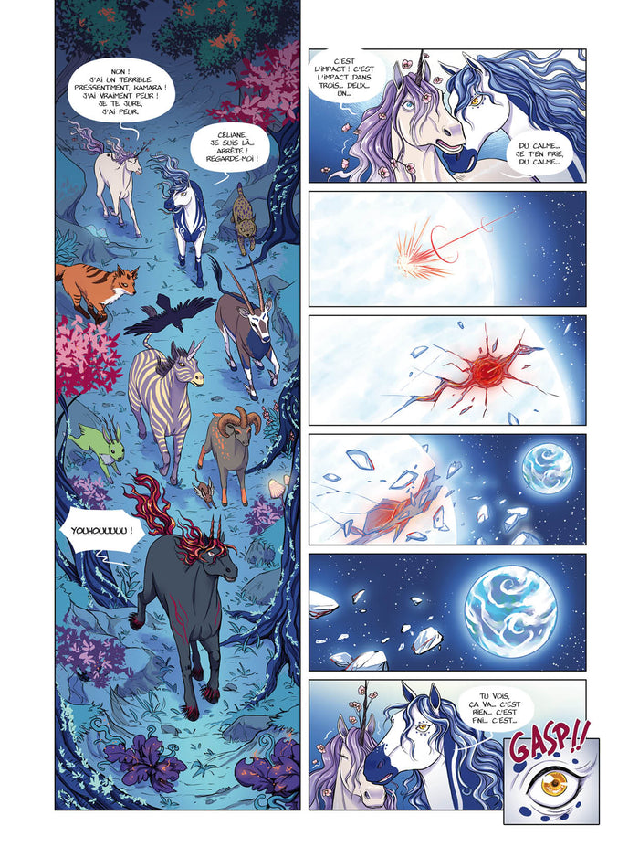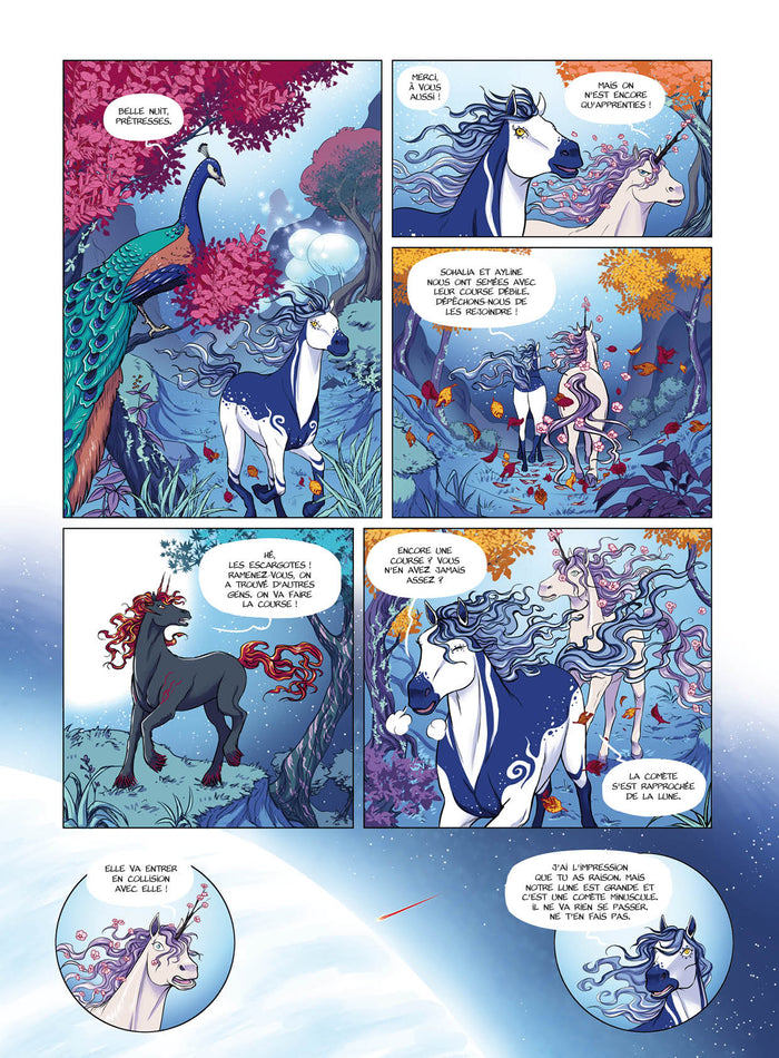 À la pleine lune, quatre jeunes filles se transforment en chevaux fantastiques ! Kamara, Ayline, Sohalia et Céliane sont des adolescentes inséparables, de vraies sœurs de cœur. À la pleine lune, elles se métamorphosent en chevaux fantastiques ! Cheval étoilé, Cheval-taureau, Cheval ailé et Licorne fleurie, elles sont fortes, libres et sauvages. Jusqu'au jour où la lune, victime d'une collision céleste, éclate en mille morceaux. La catastrophe est terrible pour Equinox : le climat se dérègle, les gens terrifiés deviennent dangereux, les transformations oscillent entre l'humain et l'animal. Que peuvent faire Kamara et ses sœurs pour sauver ce monde qui s'effondre ? Afficher moinsAfficher plus