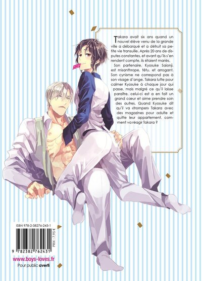 PrésentationTakara avait six ans quand un nouvel élève venu de la grande ville a débarqué et a détruit sa petite vie transuille. Après 20 ans de disputes constantes, et avant qu'ils s'en rendent compte, ils étaient mariés. Son partenaire, Kyosuke Saionji, est misanthrope, têtu, et arrogant. Son cynisme ne correspond pas à son visage d'ange. Takara lutte pour calmer Kyosuke à chaque jour qui passe, mais malgré ce qu'il laisse paraître, celui-ci est a en fait un grand coeur et aime prendre soin des autres. Quand Kyosuke dit qu'il va "tromper" Takara avec des magazines pour adulte et quitte leur appartement, comment va réagir Takara ? Afficher moinsAfficher plus