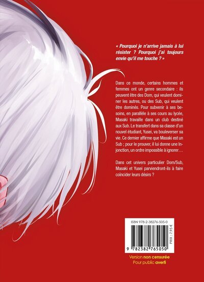 Note promotionnelleDans cet univers particulier Dom/Sub, Masaki et Yusei parviendront-ils à faire coïncider leurs désirs ?,PrésentationDans ce monde, certains hommes et femmes ont un genre secondaire : ils peuvent être des Dom, qui veulent dominer les autres, ou des Sub, qui veulent être dominés. Pour subvenir à ses besoins, en parallèle à ses cours au lycée, Masaki travaille dans un club destiné aux Sub. Le transfert dans sa classe d'un nouvel étudiant, Yusei, va bouleverser sa vie. Ce dernier affirme que Masaki est un Sub , pour le prouver, il lui donne une Injonction, un ordre impossible à ignorer... Afficher moinsAfficher plus