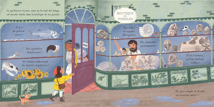 Aurore et son chien Hippolyte vivent au bord de la mer. Ils adorent fouiller le rivage pour dénicher des trésors, qu'Aurore vend ensuite dans la boutique de fossiles de ses parents. Lorsqu'Aurore met au jour les ossements d'un dinosaure jamais vu, elle sait qu'elle a fait une grande découverte. Mais un homme coiffé d'un haut-de-forme lui vole ses ossements et tente de se les approprier ! La course est lancée... Aurore parviendra-t-elle à prouver que c'est bien elle qui a trouvé les os de dinosaure ? Inspiré de l'histoire vraie de la paléontologue Mary Anning, cet album est parfait pour les petits chasseurs de trésors qui croient en leurs rêves. Afficher moinsAfficher plus