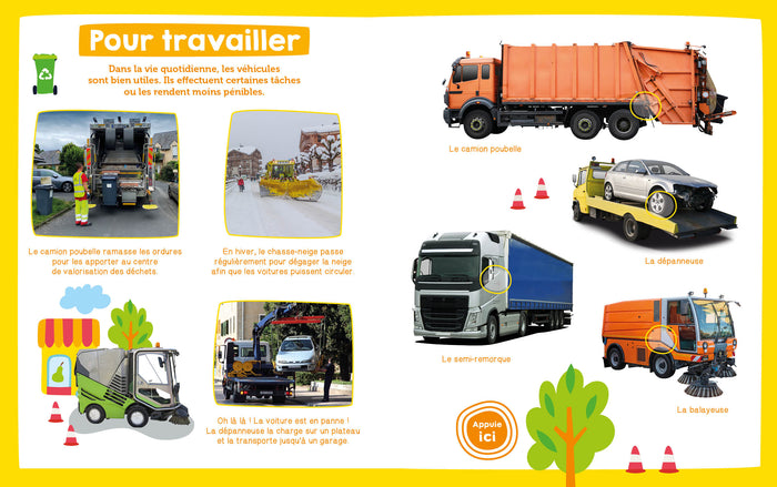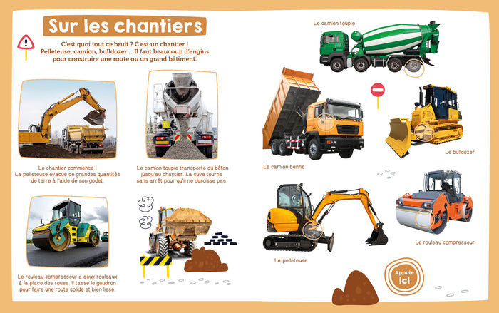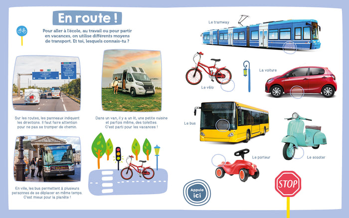 Dans cet imagier tout en photographies, les enfants vont découvrir les véhicules à travers 7 thématiques (sur la route, pour travailler, les secours, dans les champs, sur les chantiers, sur l'eau et dans le ciel, anciens et modernes). Les 36 puces sonores vont leur permettre d'associer les bruits des véhicules aux images : une joyeuse façon d'apprendre du vocabulaire tout en développant la motricité main/œil/oreille des tout-petits. Afficher moinsAfficher plus