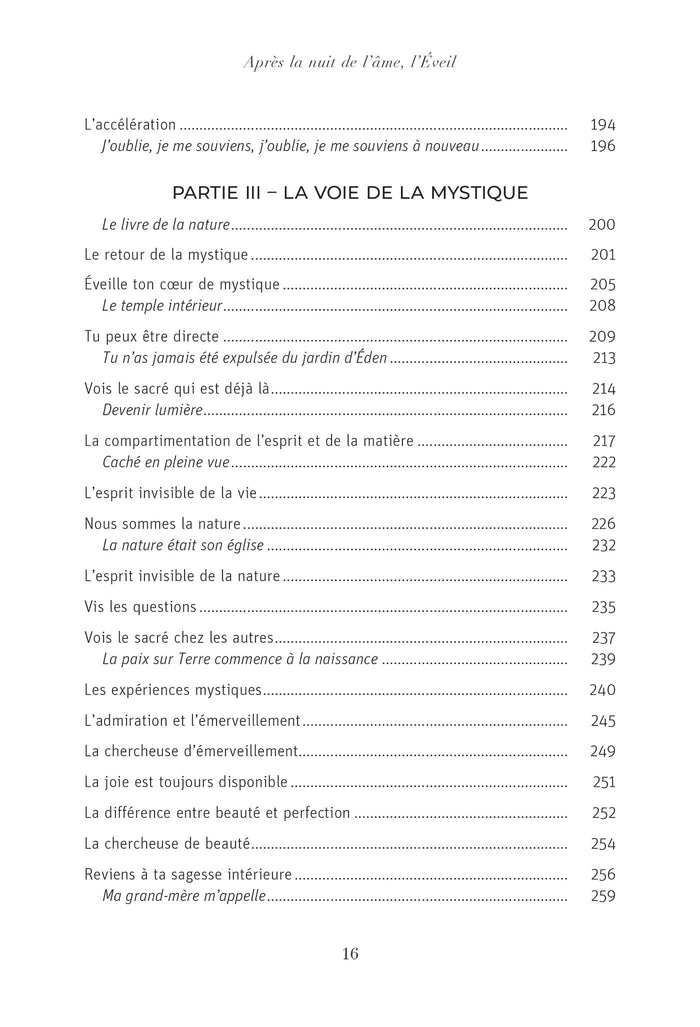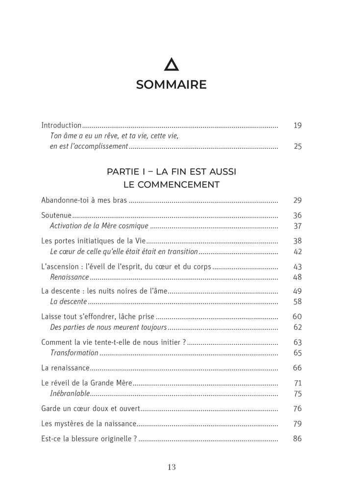Note biographique Rebecca Campbellest auteure, poète, mystique et artiste. Fascinée par les grands mystères de la vie, elle a répondu à un appel intérieur qui l'a conduite sur les sites sacrés de ses ancêtres à l'âge de 18 ans et depuis, a vécu de nombreuses expériences d'éveil initiatique. Elle est l'auteure de nombreux coffrets best-sellers. Site internet : www.rebeccacampbell.me Instagram : @rebeccacampbell_author ,Sommaire INTRODUCTION Ton âme a eu un rêve, et ta vie, cette vie, en est l'accomplissement Partie I – LA FIN est aussi le COMMENCEMENT ABANDONNE-TOI À MES BRAS SOUTENUE LES PORTES INITIATIQUES DE LA VIE ASCENSION : L'ÉVEIL DE L'ESPRIT, DU CŒUR ET DU CORPS DESCENTE : LES NUITS NOIRES DE L'ÂME La Descente LAISSE TOUT S'EFFONDRER, LÂCHE PRISE des parties de nous meurent toujours COMMENT LA VIE TENTE-T-ELLE DE NOUS INITIER ? transformation RENAISSANCE LE RÉVEIL DE LA GRANDE MÈRE inébranlable GARDE UN CŒUR DOUX ET OUVERT LES MYSTÈRES DE LA NAISSANCE EST-CE LA BLESSURE ORIGINELLE ? DEUIL, PUISSANCE ET RAGE DES LIGNÉES FÉMININES la grande mère originelle QUELLE ÂME COURAGEUSE naissance d'une guérisseuse NOTRE DEUIL NOUS MONTRE COMBIEN NOUS AIMONS nouveau départ DÉPOSE-LE SUR L'AUTEL OUVRE-TOI AU SOUTIEN APRÈS LA PLUIE UN NOUVEAU JOUR SE LÈVE seconde floraison Partie II – TU CHEMINES vers LE SACRÉ la médecine du deuil LA GUÉRISON SE PRODUIT TOUJOURS Plus tout à fait celle que j'étais, pas encore celle que je serai LE MYSTÈRE DE LA GUÉRISON nature EN PERPÉTUEL CHANGEMENT la pierre a roulé SAISONS INTÉRIEURES ET EXTÉRIEURES l'école des mystères de la nature HONORER LES FINS ET LE VIDE FERTILE DES NOUVEAUX COMMENCEMENTS je ne suis pas celle que je pensais être ÉVOLUTION ET PERTE QUAND LES AMITIÉS SE TERMINENT LAISSE-LE TE BRISER POUR MIEUX TE RECONSTRUIRE LIBÉRER LES PÉTALES DU PASSÉ Le vide fertile de son devenir SECONDE FLORAISON effondrement NOUS FUIONS TOUTES QUELQUE CHOSE À QUOI ASPIRE-TU VRAIMENT ? une centaine de personnes différentes LIBÈRE TON ÂME la prison d'une vie consciemment créée ÊTRE AIMÉES POUR QUI NOUS SOMMES, NON POUR CE QUE NOUS SOMMES récupération d'âme RIEN NE CLOCHE CHEZ TOI le temple, c'est toi LES STRATES INVISIBLES DE LA GUÉRISON individuation CELLE QUI A LE COURAGE DE GUÉRIR briseuse de cycle BRISEUSES DE CYCLE Puissions-nous être libérées, délivrées, à jamais libres MÈRE, NOTRE PREMIER AMOUR GUÉRIR LA LIGNÉE MATERNELLE guérir la lignée maternelle LE POUVOIR DE LA COLÈRE : CRÉATION OU DESTRUCTION INTÉGRATION ET GUÉRISON RECONNEXION À SOI ET AUX AUTRES NOUS SOMMES ICI POUR CELA LAISSE TON ÂME S'ÉVEILLER le rêve éveillé ACCÉLÉRATION j'oublie, je me souviens, j'oublie, je me souviens à nouveau Partie III – LA VOIE de la MYSTIQUE le livre de la nature LE RETOUR DE LA MYSTIQUE ÉVEILLE TON CŒUR DE MYSTIQUE le temple intérieur TU PEUX ÊTRE DIRECTE tu n'as jamais été expulsée du jardin d'Eden VOIR LE SACRÉ QUI EST DÉJÀ LÀ devenir lumière COMPARTIMENTATION DE L'ESPRIT ET DE LA MATIÈRE caché en pleine vue L'ESPRIT INVISIBLE DE LA VIE NOUS SOMMES LA NATURE la nature était son église L'ESPRIT INVISIBLE DE LA NATURE VIVRE LES QUESTIONS VOIR LE SACRÉ CHEZ LES AUTRES la paix sur terre commence à la naissance EXPÉRIENCES MYSTIQUES ADMIRATION ET ÉMERVEILLEMENT CHERCHEUSE D'ÉMERVEILLEMENT LA JOIE EST TOUJOURS DISPONIBLE DIFFÉRENCE ENTRE BEAUTÉ ET PERFECTION CHERCHEUSE DE BEAUTÉ REVENIR À NOTRE SAGESSE INTÉRIEURE ma grand-mère m'appelle L'INVITATION FUTURES ANCÊTRES DE LA TERRE perte d'âme CODES DES FLEURS ET PLANTES SAUVAGES RALENTIR AU RYTHME DE LA TERRE MAGNÉTISME NATUREL SOIS PRODUCTIVE, NE FAIS RIEN TU N'ES PAS NORMALE, ET C'EST NORMAL LA CHUTE DU PIÉDESTAL PUISSANCE ET SIMPLICITÉ LIBÉRER NOTRE CŒUR SAUVAGE DE MYSTIQUE CRÉER VS. PRODUIRE : MYSTIQUE VS. MACHINE TU ES VENUE ICI AVEC UNE MÉDECINE, PAS DES BONBONS LES CELLULES IMAGINALES OSE EMBRASSER LE RÊVE LE PLUS FOU DE TON ÂME RENCONTRER LE MYSTÈRE SAVOIR QUAND POUSSER OU S'ABANDONNER LE CHANT DE L'ÂME multitude SUIVRE TON CHEMIN SACRÉ l'âme au centre GUIDÉE DE L'INTÉRIEUR la tisseuse RECONNECTE-TOI AU FIL D'OR DE TA VIE Ce sont les mystères de la mort. Ce sont les mystères de la naissance. Ce sont les mystères de la vie RESSOURCES REMERCIEMENTS À PROPOS DE L'AUTEURE ,PrésentationUne lecture incontournable pour quiconque cherche la lumière dans l'obscurité. Cet ouvrage vous aidera à sortir plus forte et plus authentique des plus grands défis de la vie. Nous pensons souvent que l'obscurité annonce la fin alors qu'elle peut être synonyme de renouveau. Chacun de nous vit dans un état constant de changement, de croissance et de transformation. Mais pour que la renaissance ait lieu, nous devons trouver le courage de renoncer à qui nous étions autrefois afin de créer un espace pour la personne que nous " devenons ". Dans cet ouvrage inspirant, Rebecca Campbell partage son parcours personnel pour nous apprendre à nous ouvrir à la guérison et à nous reconnecter à l'esprit-même de la Vie. Au fil des pages, vous découvrirez comment : • surmonter vos nuits noires de l'âme ; • accueillir les grands cycles de la vie et traverser les portes initiatiques ; • conscientiser que la guérison est toujours en cours ; • vous laisser porter et soutenir par le monde invisible qui vous entoure ; • embrasser la voie du mystique et parcourir votre chemin sacré... Puisse ce livre vous accompagner à travers les saisons changeantes de votre vie, vous inviter à vivre courageusement et à dire " oui " à toutes les initiations pour aller vers la lumière... Afficher moinsAfficher plus