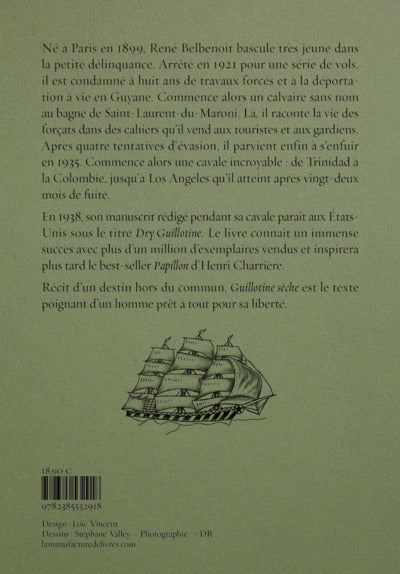 Présentation Né à Paris en 1899, René Belbenoît bascule très jeune dans la petite délinquance. Arrêté en 1921 pour une série de vols, il est condamné à huit ans de travaux forcés et à la déportation à vie en Guyane. Commence alors un calvaire sans nom au bagne de Saint-Laurent-du-Maroni. Là, il raconte la vie des forçats dans des cahiers qu'il vend aux touristes et aux gardiens. Après quatre tentatives d'évasion, il parvient enfin à s'enfuir en 1935. Commence alors une cavale incroyable : de Trinidad à la Colombie, jusqu'à Los Angeles qu'il atteint après vingt-deux mois de fuite. En 1938, son manuscrit rédigé pendant sa cavale paraît aux États-Unis sous le titre Dry Guillotine. Le livre connaît un immense succès avec plus d'un million d'exemplaires vendus et inspirera plus tard le best-seller Papillon d'Henri Charrière. Récit d'un destin hors du commun, Guillotine sèche est le texte poignant d'un homme prêt à tout pour sa liberté. Afficher moinsAfficher plus