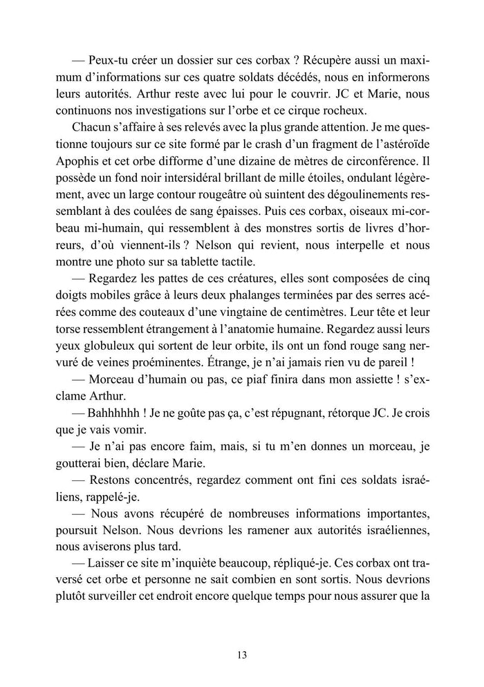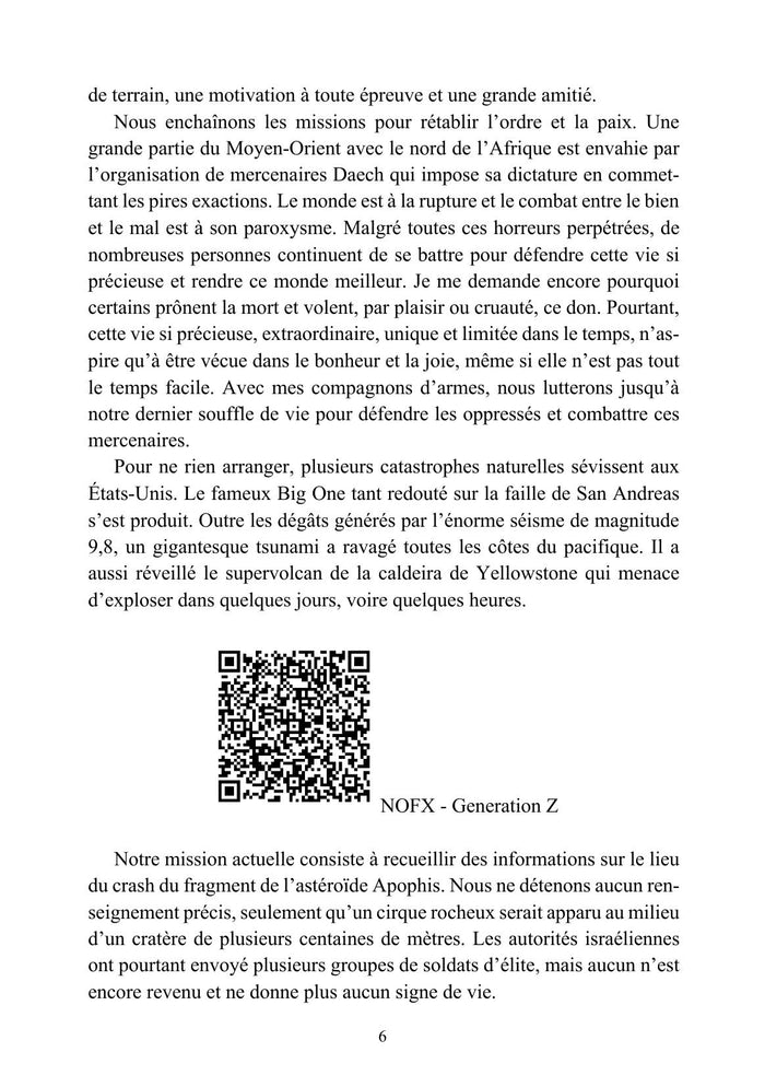 PrésentationMême si le pire a été évité in extremis, la situation reste critique après le crash d'un fragment de l'astéroïde Apophis. Angel, Marie, Arthur, Nelson et JC, soldats d'élite de l'escouade française Hope, partent en mission de reconnaissance dans le désert du Néguev où plusieurs patrouilles de soldats envoyés en éclaireurs ne donnent plus signe de vie. Mais l'opération prend une tout autre dimension lorsque des créatures terrifiantes traversent un orbe étrange et reviennent quelques heures plus tard avec une adolescente qu'ils ont kidnappée. N'écoutant que leur bravoure, un seul objectif anime désormais les frères d'armes : sauver cette jeune fille. La mission s'avère vite plus complexe que prévu... Afficher moinsAfficher plus